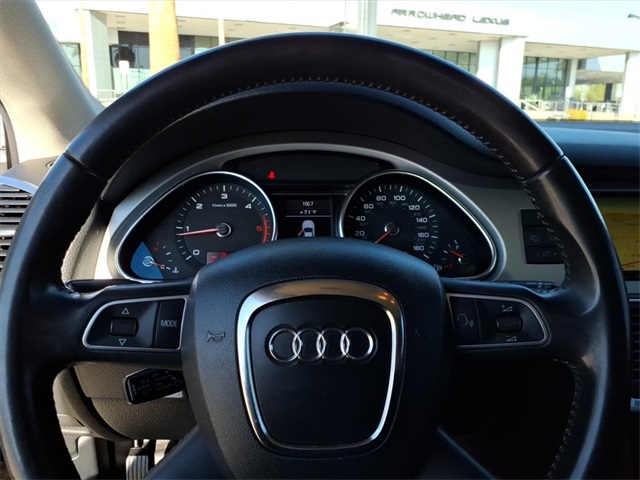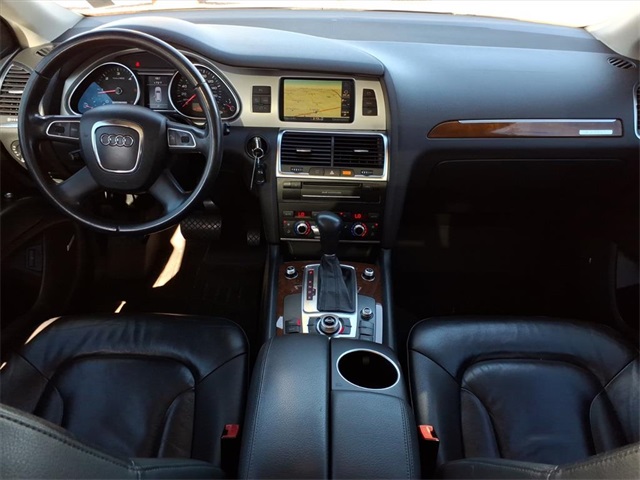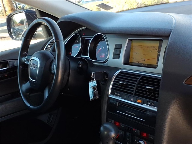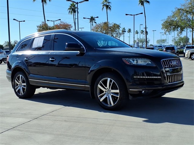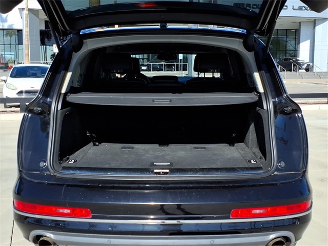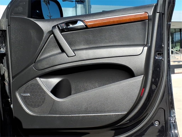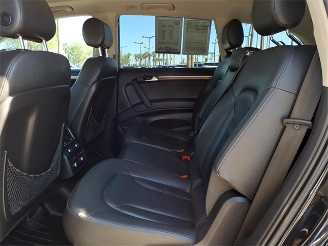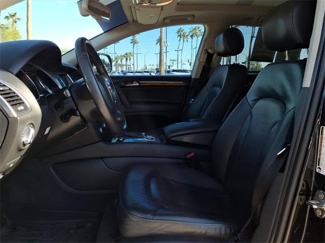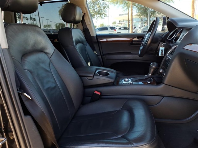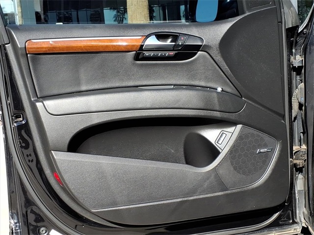 This Audi Q7 is equipped with the following features: 3.0L V6 TDI DOHC, ABS brakes, Alloy wheels, AM/FM radio: SIRIUS, Compass, Electronic Stability Control, Front dual zone A/C, Heated door mirrors, Heated Front Bucket Seats, Heated front seats, Illuminated entry, Low tire pressure warning, Power Liftgate, Remote keyless entry, Traction control, 11 Speakers, 19" 5-Arm V Cast Alloy Wheels, 3.27 Axle Ratio, 3rd row seats: bench, 4-Wheel Disc Brakes, Air Conditioning, AM/FM/In-Dash 6CD Changer, Auto-dimming Rear-View mirror, Automatic temperature control, Brake assist, Bumpers: body-color, CD player, Delay-off headlights, Driver door bin, Driver vanity mirror, Driver's Seat Mounted Armrest, Dual front impact airbags, Dual front side impact airbags, Four wheel independent suspension, Front anti-roll bar, Front Bucket Seats, Front fog lights, Front reading lights, Fully automatic headlights, Garage door transmitter: HomeLink, Genuine wood console insert, Genuine wood dashboard insert, Genuine wood door panel insert, Leather Seating Surfaces, Leather Shift Knob, Leather steering wheel, Occupant sensing airbag, Outside temperature display, Overhead airbag, Overhead console, Panic alarm, Passenger door bin, Passenger seat mounted armrest, Passenger vanity mirror, Power door mirrors, Power driver seat, Power passenger seat, Power steering, Power windows, Radio data system, Rain sensing wipers, Rear anti-roll bar, Rear fog lights, Rear reading lights, Rear seat center armrest, Rear window defroster, Rear window wiper, Roof rack: rails only, Security system, Speed control, Speed-sensing steering, Split folding rear seat, Spoiler, Steering wheel mounted audio controls, Tachometer, Telescoping steering wheel, Tilt steering wheel, Trip computer, Turn signal indicator mirrors, and Variably intermittent wipers.