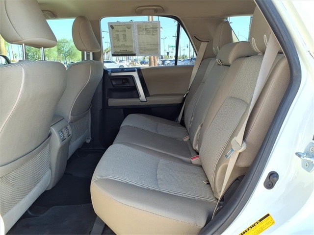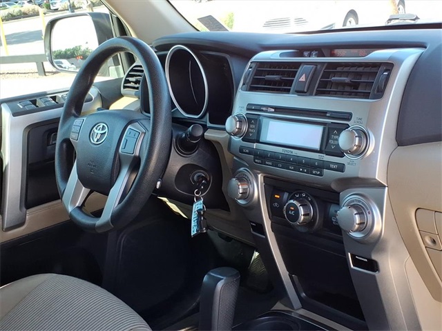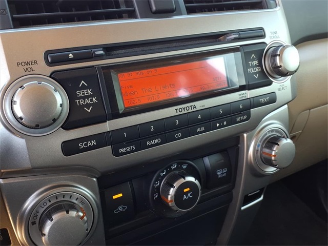 This Toyota 4Runner is equipped with the following features: Sand Beige w/Low Fabric Seat Trim or Sport Fabric Seat Trim or Leather Seat Trim, 17" x 7" Silver Alloy Wheels, 3.727 Axle Ratio, 4-Wheel Disc Brakes, 8 Speakers, ABS brakes, Air Conditioning, Alloy wheels, AM/FM radio, Anti-whiplash front head restraints, Brake assist, Bucket Seats, Bumpers: body-color, CD player, Compass, Driver door bin, Driver vanity mirror, Dual front impact airbags, Dual front side impact airbags, Electronic Stability Control, Front anti-roll bar, Front Bucket Seats, Front Center Armrest, Front fog lights, Front reading lights, Front wheel independent suspension, Garage door transmitter: HomeLink, Heated door mirrors, Illuminated entry, Knee airbag, Low Fabric Seat Trim, Low tire pressure warning, Occupant sensing airbag, Outside temperature display, Overhead airbag, Overhead console, Panic alarm, Passenger door bin, Passenger vanity mirror, Power door mirrors, Power steering, Power windows, Radio: AM/FM/MP3 CD w/8 Speakers, Rear anti-roll bar, Rear Parking Sensors, Rear seat center armrest, Rear window defroster, Rear window wiper, Remote keyless entry, Roof rack: rails only, Speed control, Speed-sensing steering, Split folding rear seat, Spoiler, Tachometer, Telescoping steering wheel, Tilt steering wheel, Traction control, Trip computer, Turn signal indicator mirrors, Variably intermittent wipers, and Voltmeter.