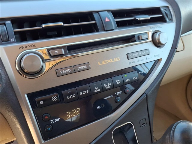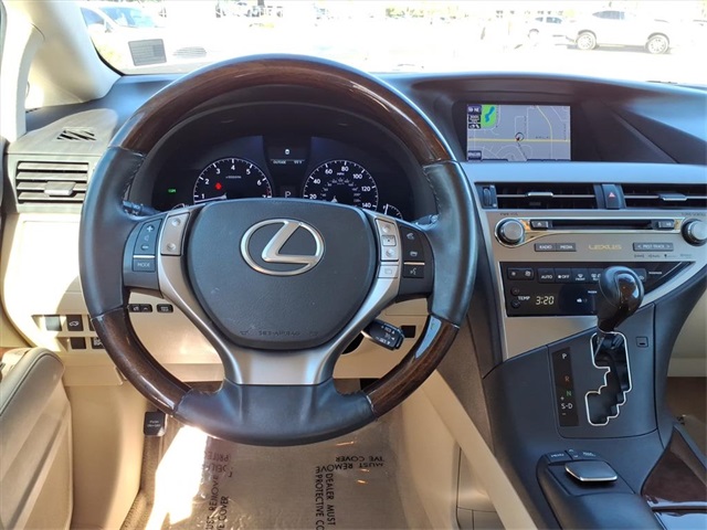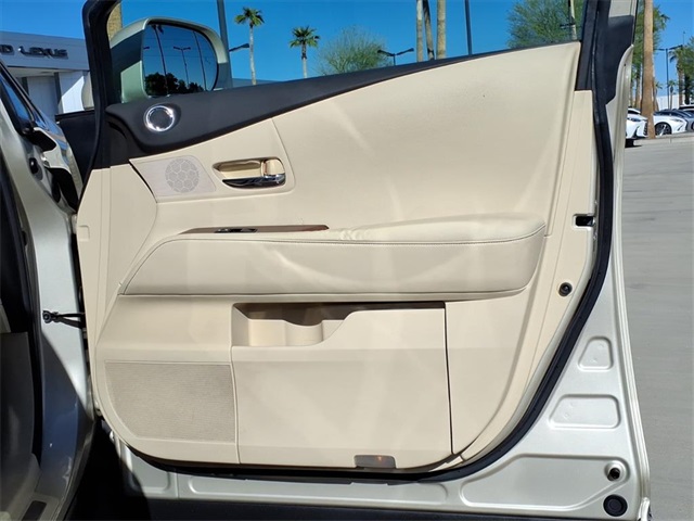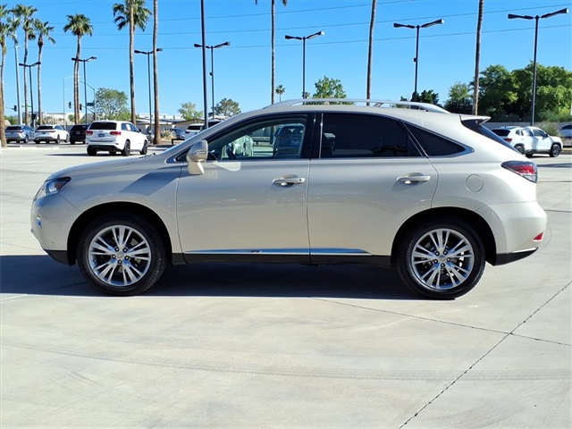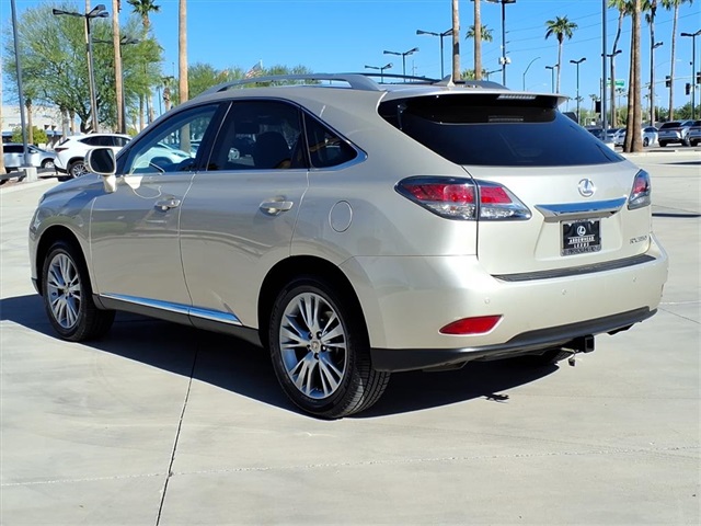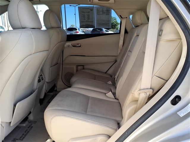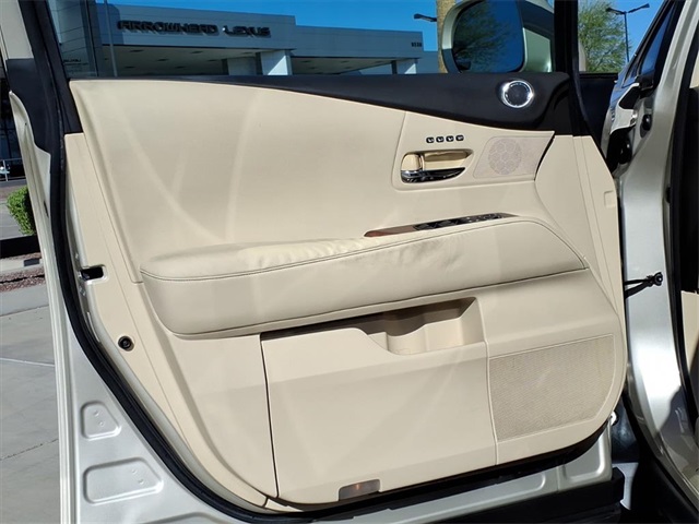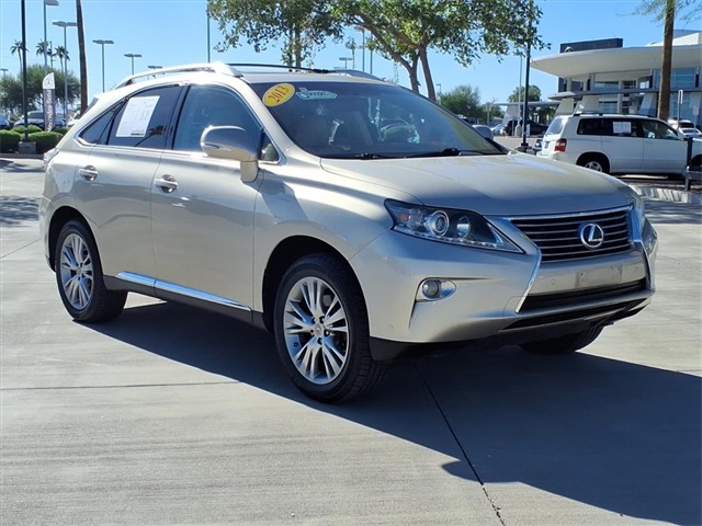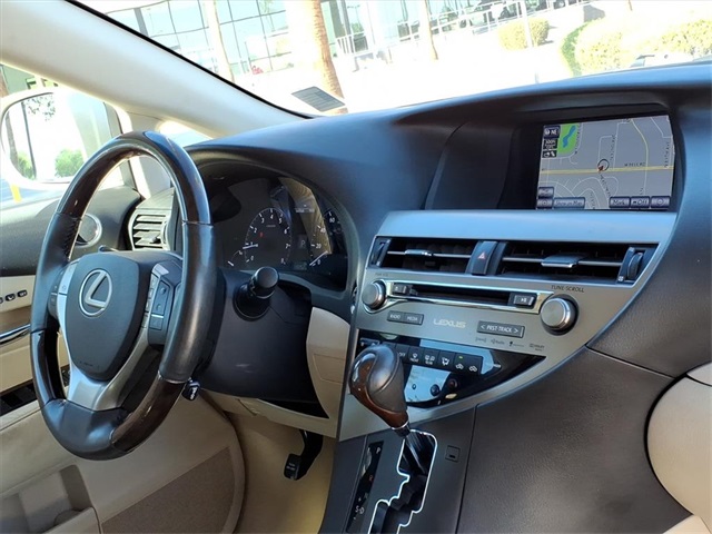 **Sun City Trade-Ins Lowest Miles Nicest Condition Vehicles in the Valley** This Lexus RX is equipped with the following features: Navigation Package (Bluetooth Hands-Free Phone, HD Radio w/iTunes Tagging, HDD Navigation System w/Advanced Voice Command, Lexus Enform 2.0 w/Safety Connect, Lexus Insider, and SiriusXM NavTraffic/NavWeather), Premium Package (Driver Seat/Steering/Mirror Memory - 3 Settings, Leather Seat Trim, One-Touch Open/Close Moonroof, Power-Folding Electrochromic Outside Mirrors, Rear Armrest Storage w/Lid, and Roof Rails), Parchment w/Semi-Aniline Leather Seat Trim, 18" x 7.5" 5-Spoke Aluminum Wheels, 19" x 7.5" Triple-Split 5-Spoke Aluminum Wheels, 4-Wheel Disc Brakes, 4.398 Axle Ratio, 9 Speakers, ABS brakes, Air Conditioning, Alloy wheels, AM/FM radio: SiriusXM, Anti-whiplash front head restraints, Auto-dimming door mirrors, Auto-dimming Rear-View mirror, Automatic temperature control, Brake assist, Bumpers: body-color, CD player, Compass, Delay-off headlights, Driver door bin, Driver vanity mirror, Dual front impact airbags, Dual front side impact airbags, Electronic Stability Control, Emergency communication system: Safety Connect, Fabric Seat Trim, Four wheel independent suspension, Front anti-roll bar, Front Bucket Seats, Front Center Armrest, Front dual zone A/C, Front fog lights, Front reading lights, Fully automatic headlights, Garage door transmitter: HomeLink, Genuine wood console insert, Genuine wood door panel insert, Heated door mirrors, Illuminated entry, Knee airbag, Low tire pressure warning, Navigation System, Occupant sensing airbag, Outside temperature display, Overhead airbag, Overhead console, Panic alarm, Passenger door bin, Passenger vanity mirror, Power door mirrors, Power driver seat, Power Liftgate, Power passenger seat, Power steering, Power windows, Radio data system, Rear anti-roll bar, Rear reading lights, Rear seat center armrest, Rear side impact airbag, Rear window defroster, Rear window wiper, Remote keyless entry, Security system, Speed control, Speed-sensing steering, Split folding rear seat, Spoiler, Steering wheel mounted audio controls, Tachometer, Telescoping steering wheel, Tilt steering wheel, Traction control, Trip computer, Turn signal indicator mirrors, and Variably intermittent wipers.