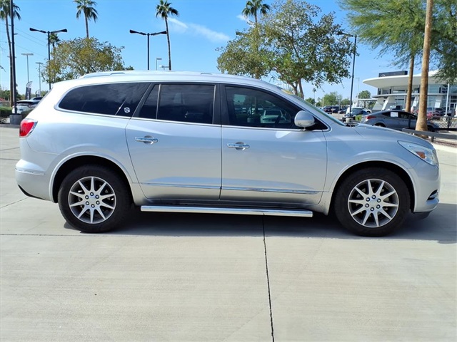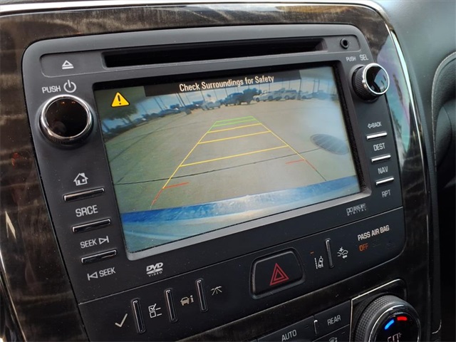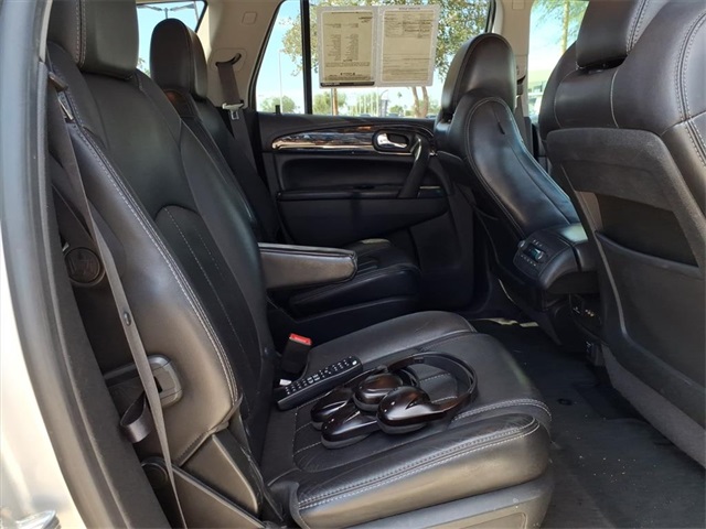 This Buick Enclave is equipped with the following features: Premium Package (Articulating Headlights, Heated & Cooled Driver & Front Passenger Seats, Power Tilt & Telescopic Steering Column, and Power-Folding Heated Body-Color Outside Mirrors), FWD, 10 Speakers, 19" 9-Spoke Chrome-Clad Aluminum Wheels, 3.16 Axle Ratio, 3rd row seats: split-bench, 4-Wheel Disc Brakes, 7-Passenger Seating, 8-Way Power Driver Seat Adjuster, 8-Way Power Passenger Seat Adjuster, ABS brakes, Air Conditioning, Alloy wheels, AM/FM radio: SiriusXM, Auto tilt-away steering wheel, Auto-dimming door mirrors, Auto-dimming Rear-View mirror, Automatic temperature control, Bose Advanced 10-Speaker Audio System, Bose Performance Enhanced System, Brake assist, Bumpers: body-color, CD player, Compass, Delay-off headlights, Driver door bin, Driver vanity mirror, Dual front impact airbags, Dual front side impact airbags, Electronic Stability Control, Emergency communication system: OnStar Directions & Connections, ETR AM/FM Stereo w/CD Player & MP3 Playback, Exterior Parking Camera Rear, Four wheel independent suspension, Front anti-roll bar, Front Bucket Seats, Front Center Armrest w/Storage, Front dual zone A/C, Front reading lights, Fully automatic headlights, Garage door transmitter, Heated door mirrors, Heated front seats, High intensity discharge headlights: Bi-Xenon, Illuminated entry, Leather steering wheel, Low tire pressure warning, Memory seat, Memory Settings, Occupant sensing airbag, Outside temperature display, Overhead airbag, Panic alarm, Passenger door bin, Passenger vanity mirror, Perforated Leather Seating Surfaces, Power door mirrors, Power driver seat, Power Liftgate, Power passenger seat, Power steering, Power windows, Premium audio system: IntelliLink, Premium Ride Suspension, Radio data system, Rear air conditioning, Rear anti-roll bar, Rear audio controls, Rear Audio System Controls, Rear reading lights, Rear window defroster, Rear window wiper, Remote keyless entry, Roof rack: rails only, Security system, Side Blind Zone Alert w/Cross Traffic Alert, SiriusXM Satellite Radio, Speed control, Speed-sensing steering, Spoiler, Steering wheel memory, Steering wheel mounted audio controls, Tachometer, Telescoping steering wheel, Tilt steering wheel, Traction control, Trip computer, Turn signal indicator mirrors, Variably intermittent wipers, Ventilated front seats, and Voltmeter.