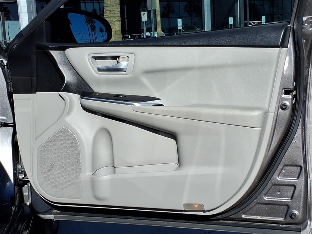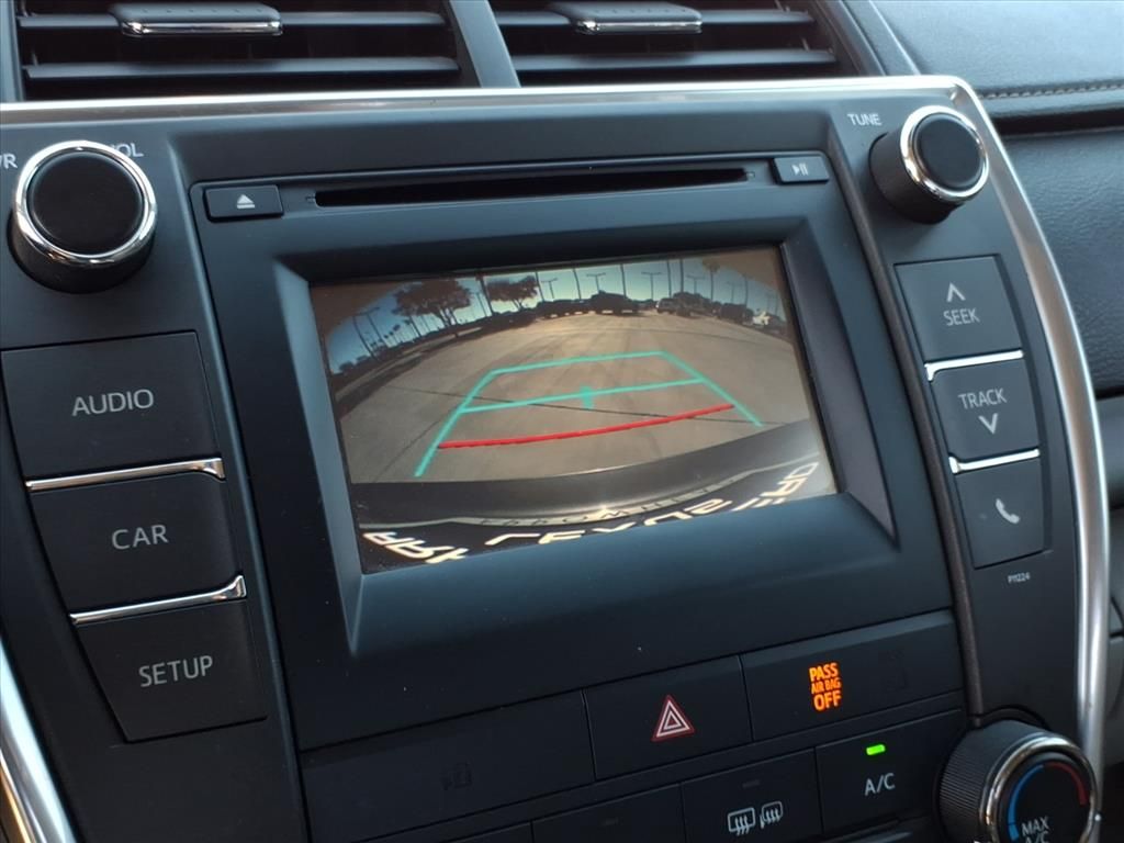 This Toyota Camry is equipped with the following features: Black w/Fabric Seat Trim, 4-Wheel Disc Brakes, 6 Speakers, ABS brakes, Air Conditioning, AM/FM radio, Brake assist, Bumpers: body-color, CD player, Delay-off headlights, Driver door bin, Driver vanity mirror, Dual front impact airbags, Dual front side impact airbags, Electronic Stability Control, Exterior Parking Camera Rear, Fabric Seat Trim, Four wheel independent suspension, Front anti-roll bar, Front Bucket Seats, Front Center Armrest, Front reading lights, Fully automatic headlights, Heated door mirrors, Illuminated entry, Knee airbag, Low tire pressure warning, Occupant sensing airbag, Outside temperature display, Overhead airbag, Overhead console, Panic alarm, Passenger door bin, Passenger vanity mirror, Power door mirrors, Power driver seat, Power steering, Power windows, Radio: Entune Audio, Rear anti-roll bar, Rear seat center armrest, Rear side impact airbag, Rear window defroster, Remote keyless entry, Speed control, Speed-sensing steering, Split folding rear seat, Steering wheel mounted audio controls, Tachometer, Telescoping steering wheel, Tilt steering wheel, Traction control, Trip computer, Variably intermittent wipers, and Wheels: 7.0J x 16" Steel.