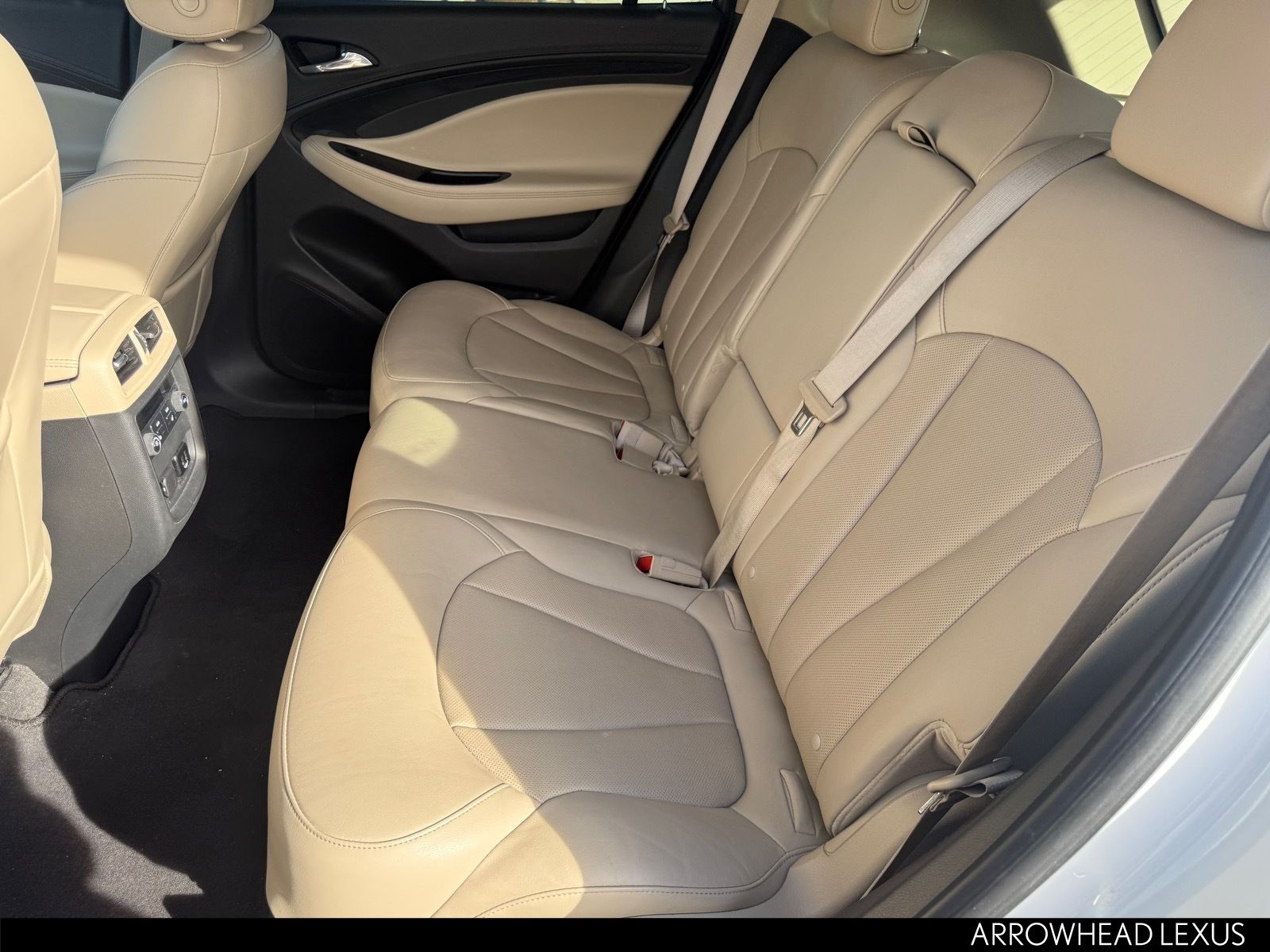 This Buick Envision is equipped with the following features: Cargo Package (LPO) (Cargo Net and Cargo Shade), Preferred Equipment Group 1SL, 18" 10-Spoke Polished Aluminum Wheels, 3.50 Final Drive Axle Ratio, 4-Wheel Disc Brakes, 6 Speakers, 6-Speaker Audio System Feature, ABS brakes, Air Conditioning, Alloy wheels, AM/FM radio: SiriusXM, Apple CarPlay/Android Auto, Auto-dimming door mirrors, Auto-dimming Rear-View mirror, Automatic temperature control, Brake assist, Bumpers: body-color, Compass, Delay-off headlights, Driver 8-Way Power Seat Adjuster, Driver door bin, Driver vanity mirror, Dual front impact airbags, Dual front side impact airbags, Electronic Stability Control, Emergency communication system: OnStar Guidance, Exterior Parking Camera Rear, Four wheel independent suspension, Front anti-roll bar, Front Bucket Seats, Front Center Armrest, Front dual zone A/C, Front fog lights, Front Passenger 8-Way Power Seat Adjuster, Front reading lights, Fully automatic headlights, Garage door transmitter, Heated door mirrors, Heated Driver & Front Passenger Seats, Heated front seats, Heated rear seats, Heated steering wheel, Illuminated entry, Knee airbag, Low tire pressure warning, Memory seat, Occupant sensing airbag, Outside temperature display, Overhead airbag, Overhead console, Panic alarm, Passenger door bin, Passenger vanity mirror, Perforated Leather-Appointed Seat Trim, Power door mirrors, Power driver seat, Power Liftgate, Power passenger seat, Power steering, Power windows, Premium audio system: IntelliLink, Radio data system, Radio: Buick IntelliLink AM/FM Stereo, Rear air conditioning, Rear anti-roll bar, Rear Parking Sensors, Rear reading lights, Rear seat center armrest, Rear side impact airbag, Rear window defroster, Rear window wiper, Remote keyless entry, Roof rack: rails only, Security system, SiriusXM Satellite Radio, Speed control, Speed-sensing steering, Split folding rear seat, Spoiler, Steering wheel mounted audio controls, Tachometer, Telescoping steering wheel, Tilt steering wheel, Traction control, Trip computer, Turn signal indicator mirrors, and Variably intermittent wipers.