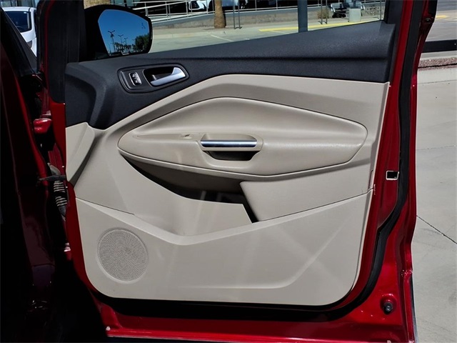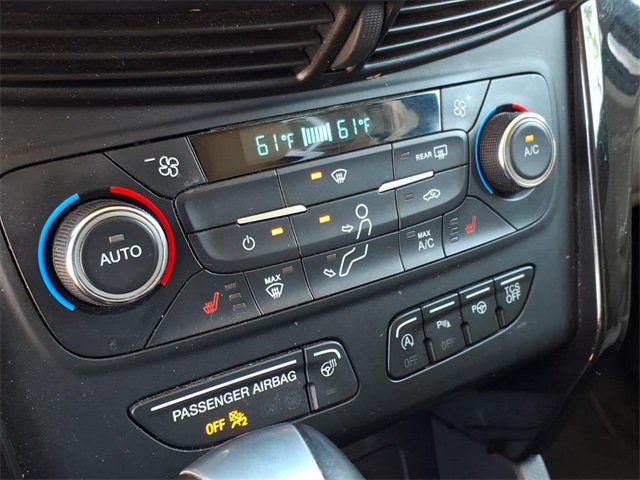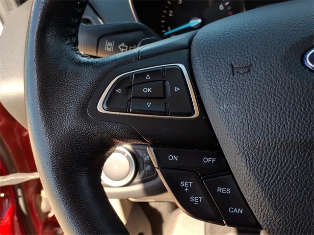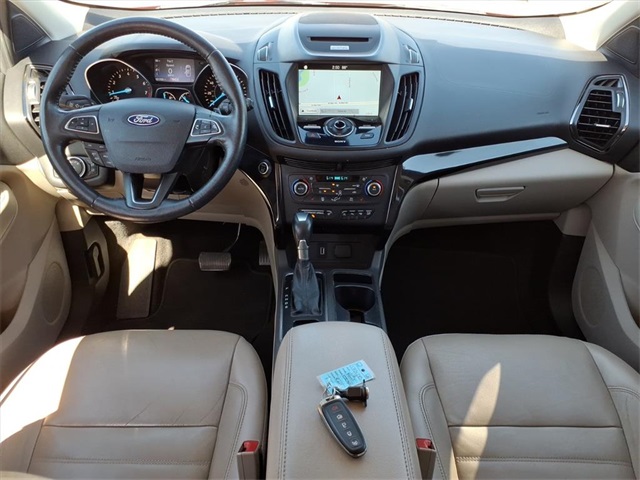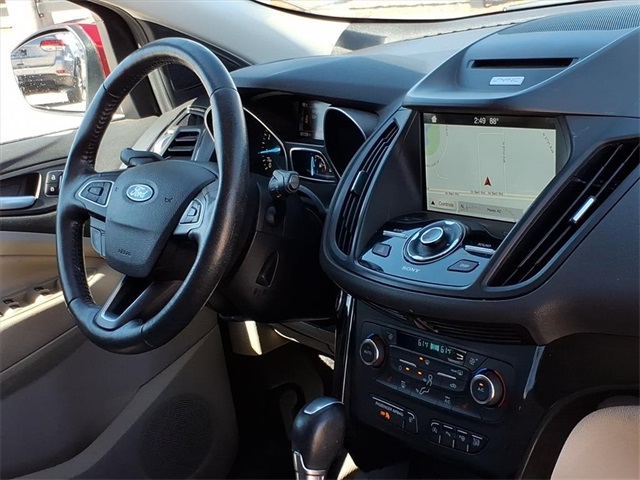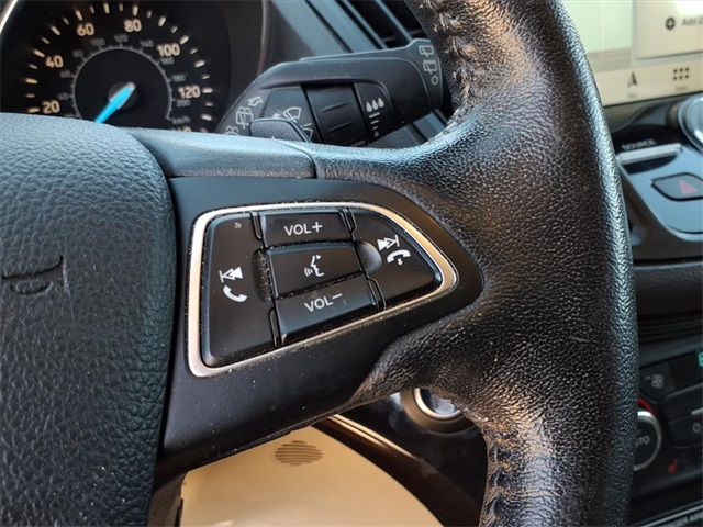 This Ford Escape is equipped with the following features: Equipment Group 301A, Titanium Technology Package (Auto High Beams, Bi-Xenon High-Intensity Discharge Headlamps, Enhanced Active Park Assist System, Heated Steering Wheel, Lane-Keeping System, and Rain-Sensing Wipers), 10 Speakers, 3.21 Axle Ratio, 4-Wheel Disc Brakes, ABS brakes, Air Conditioning, Alloy wheels, AM/FM radio: SiriusXM, Auto-dimming Rear-View mirror, Automatic temperature control, Brake assist, Bumpers: body-color, CD player, Compass, Delay-off headlights, Driver door bin, Driver vanity mirror, Dual front impact airbags, Dual front side impact airbags, Electronic Stability Control, Emergency communication system: SYNC 3 911 Assist, Exterior Parking Camera Rear, Four wheel independent suspension, Front anti-roll bar, Front Bucket Seats, Front Center Armrest, Front dual zone A/C, Front fog lights, Front reading lights, Fully automatic headlights, Garage door transmitter, Heated door mirrors, Heated front seats, Heated Leather-Trimmed Buckets w/60/40 Rear Seat, Illuminated entry, Knee airbag, Leather Shift Knob, Low tire pressure warning, Memory seat, Occupant sensing airbag, Outside temperature display, Overhead airbag, Overhead console, Panic alarm, Passenger door bin, Passenger vanity mirror, Power door mirrors, Power driver seat, Power Liftgate, Power passenger seat, Power steering, Power windows, Radio data system, Radio: AM/FM Single CD/MP3, Rear anti-roll bar, Rear Parking Sensors, Rear reading lights, Rear seat center armrest, Rear window defroster, Rear window wiper, Remote keyless entry, Roof rack: rails only, Security system, Speed control, Speed-sensing steering, Split folding rear seat, Steering wheel mounted audio controls, SYNC 3 Communications & Entertainment System, Tachometer, Telescoping steering wheel, Tilt steering wheel, Traction control, Trip computer, Turn signal indicator mirrors, Variably intermittent wipers, and Wheels: 18" Sparkle Silver-Painted Aluminum.