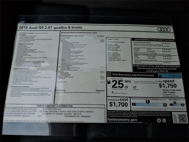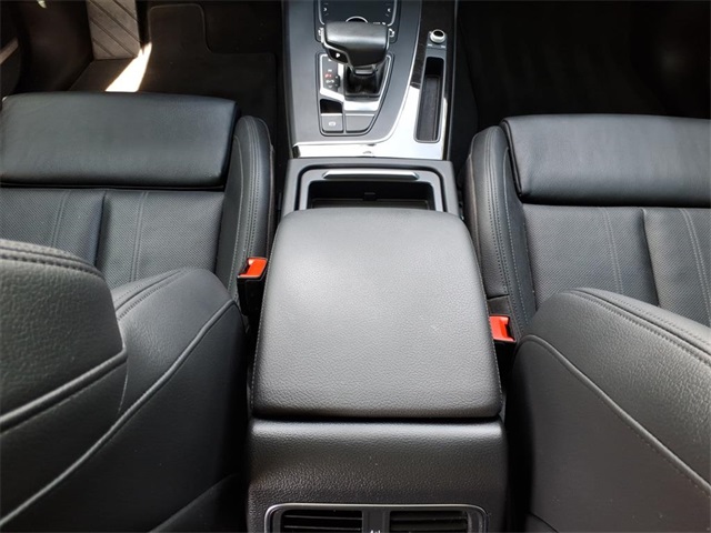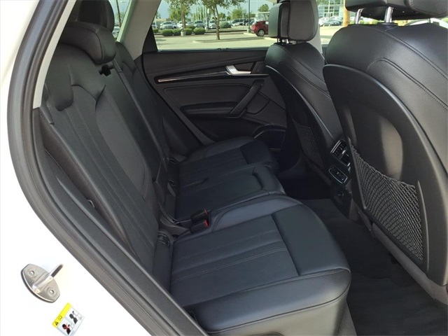 This Audi Q5 is equipped with the following features: Ambient LED Interior Lighting Plus Package, Navigation Package (Audi Connect PRIME & PLUS, Audi Virtual Cockpit, and Radio: MMI Navigation Plus System), Prestige Package (3-Step Heated Front Seats, Audi Advanced Key, Audi Connect CARE, Audi Side Assist w/Pre Sense Rear, Bang & Olufsen 3D Sound System, Color Head-Up Display, Driver Seat Memory, Front Side Windows Dual Pane Acoustic Glass, Full LED Headlights, Heated Auto-Dimming & Power-Adjustable Mirrors, High Gloss Window Surrounds, Leatherette Covered Center Console & Door Armrests, Panoramic Sunroof w/Tilt/Slide & Power Sunshade, Parking System Plus (Front/Rear Acoustic Sensors), Rear Cross Traffic Assist, SiriusXM All Access Service, Stainless Steel Door Sills, Stainless Steel Trunk Sill, Top View Camera System, Vehicle Exit Assist, and Wheels: 8" x 20" 5-Spoke Segment Design), Black w/Leather Seating Surfaces, 10 Speakers, 4-Wheel Disc Brakes, 5.302 Axle Ratio, 8-Way Power Front Bucket Seats, ABS brakes, Air Conditioning, Alloy wheels, AM/FM radio, Audi smartphone interface (Apple CarPlay/Android Auto), Auto-dimming Rear-View mirror, Automatic temperature control, Brake assist, Bumpers: body-color, Compass, Delay-off headlights, Driver door bin, Driver vanity mirror, Dual front impact airbags, Dual front side impact airbags, Electronic Stability Control, Exterior Parking Camera Rear, Four wheel independent suspension, Front anti-roll bar, Front Bucket Seats, Front Center Armrest, Front dual zone A/C, Front fog lights, Front reading lights, Garage door transmitter: HomeLink, Genuine wood console insert, Genuine wood dashboard insert, Genuine wood door panel insert, Heated door mirrors, High intensity discharge headlights: Xenon plus, Illuminated entry, Leather Seating Surfaces, Leather Shift Knob, Leather steering wheel, Low tire pressure warning, Navigation System, Occupant sensing airbag, Outside temperature display, Overhead airbag, Overhead console, Panic alarm, Passenger door bin, Passenger vanity mirror, Power door mirrors, Power driver seat, Power Liftgate, Power passenger seat, Power steering, Power windows, Radio data system, Radio: Audi Sound System w/7" TFT Color Display, Rain sensing wipers, Rear air conditioning, Rear anti-roll bar, Rear fog lights, Rear reading lights, Rear seat center armrest, Rear window defroster, Rear window wiper, Remote keyless entry, Roof rack, Security system, Speed control, Speed-sensing steering, Speed-Sensitive Wipers, Split folding rear seat, Spoiler, Steering wheel mounted audio controls, Tachometer, Telescoping steering wheel, Tilt steering wheel, Traction control, Trip computer, Turn signal indicator mirrors, Variably intermittent wipers, and Wheels: 8" x 18" 5-Double-Spoke Dynamic Design.