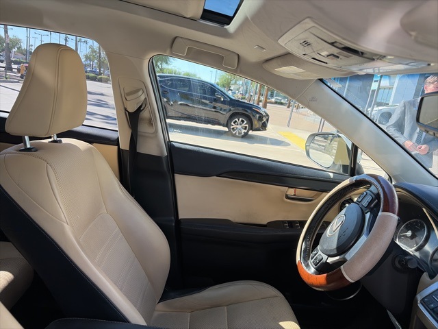 This Lexus NX is equipped with the following features: Navigation System Package (2 Additional Speakers, Lexus Enform App Suite 2.0, Lexus Enform Destination Assist, Lexus Insider, and SD Navigation System), Premium Package (18" x 7.5" Alloy Wheels, Blind Spot Monitor w/Rear Cross Traffic Alert, Driver's Seat Memory, Electrochromic Mirrors, Heated & Ventilated Front Seats, High Clearance Lamp, Power Tilt & Slide Moonroof/Sunroof, and Power Tilt & Telescopic Steering Column), 17" x 7" Alloy Wheels, 4-Wheel Disc Brakes, 8 Speakers, ABS brakes, Air Conditioning, Alloy wheels, AM/FM radio: SiriusXM, Auto High-beam Headlights, Automatic temperature control, Axle Ratio: 3.888, Brake assist, Bumpers: body-color, CD player, Compass, Delay-off headlights, Driver door bin, Driver vanity mirror, Dual front impact airbags, Dual front side impact airbags, Electronic Stability Control, Emergency communication system: Lexus Enform w/Safety Connect, Exterior Parking Camera Rear, Four wheel independent suspension, Front anti-roll bar, Front Bucket Seats, Front Center Armrest, Front dual zone A/C, Front fog lights, Front reading lights, Fully automatic headlights, Heated door mirrors, Illuminated entry, Knee airbag, Leather Shift Knob, Leather steering wheel, Low tire pressure warning, NuLuxe Seat Trim, Occupant sensing airbag, Outside temperature display, Overhead airbag, Overhead console, Panic alarm, Passenger door bin, Passenger vanity mirror, Power door mirrors, Power driver seat, Power passenger seat, Power steering, Power windows, Radio data system, Radio: AM/FM/CD Lexus Display Audio, Rear anti-roll bar, Rear seat center armrest, Rear window defroster, Rear window wiper, Remote keyless entry, Roof rack: rails only, Security system, Speed control, Speed-sensing steering, Split folding rear seat, Spoiler, Steering wheel mounted audio controls, Tachometer, Telescoping steering wheel, Tilt steering wheel, Traction control, Trip computer, Turn signal indicator mirrors, and Variably intermittent wipers.