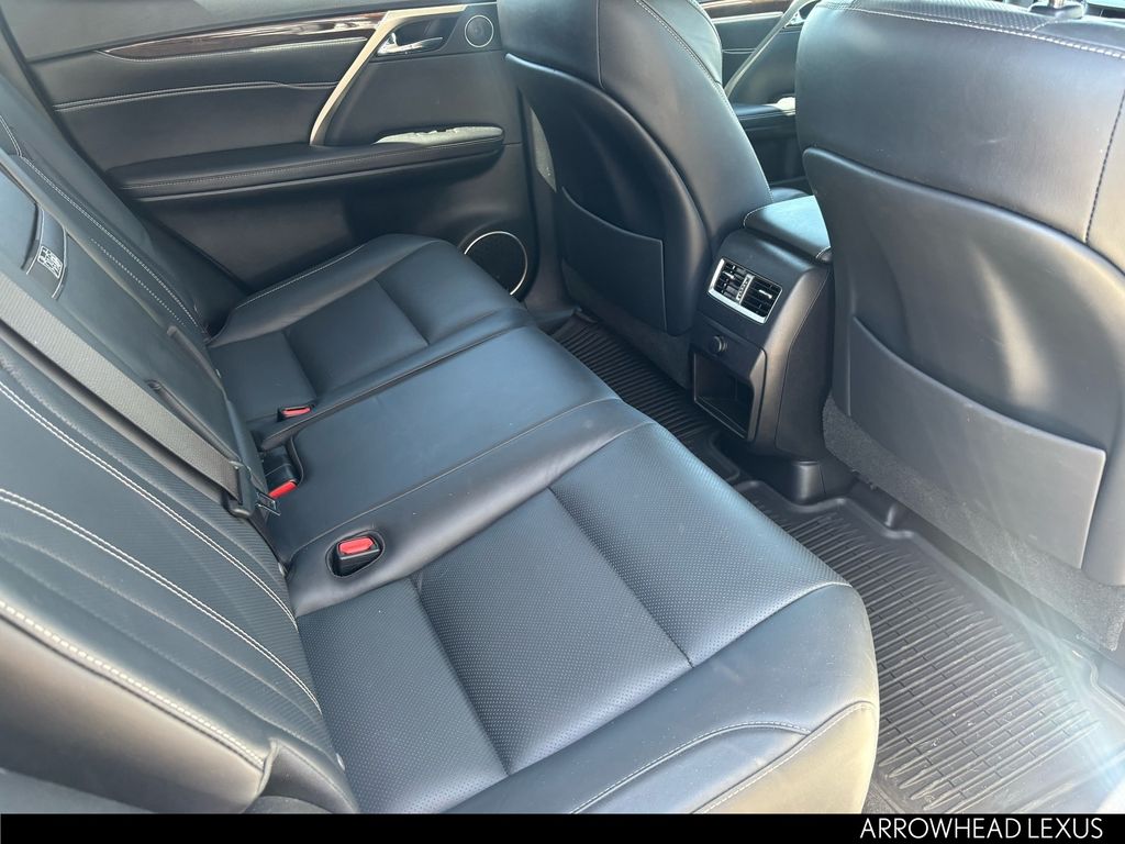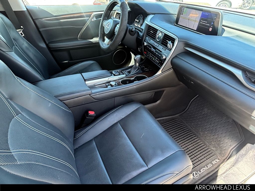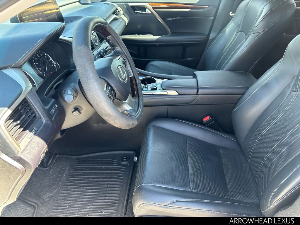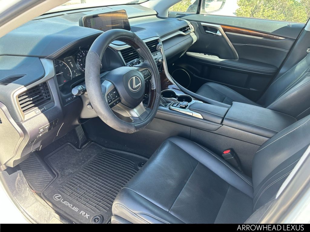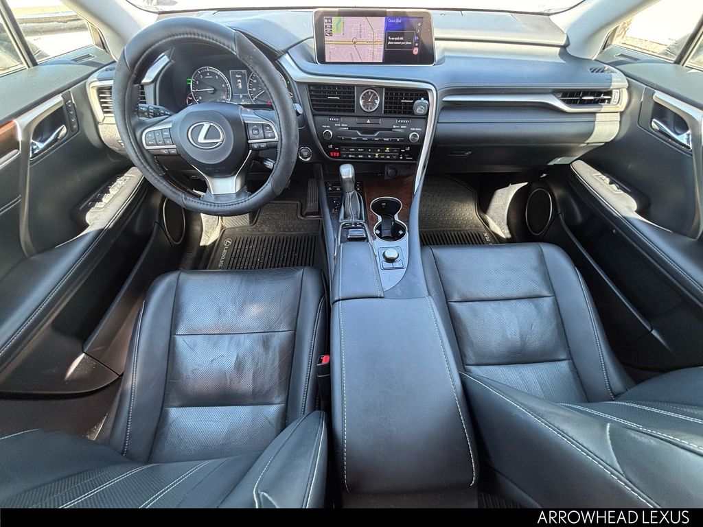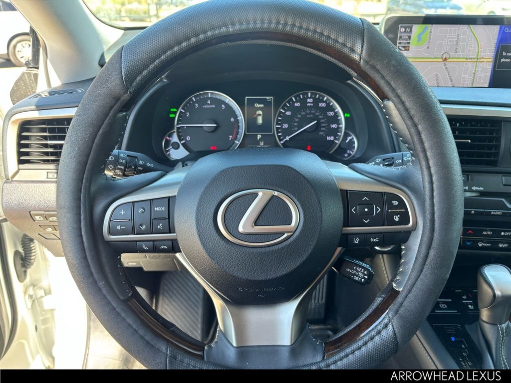 This Lexus RX is equipped with the following features: Black w/NuLuxe Seat Trim, ABS brakes, Active Cruise Control, Alloy wheels, Compass, Electronic Stability Control, Front dual zone A/C, Heated door mirrors, Illuminated entry, Low tire pressure warning, Power Liftgate, Remote keyless entry, Traction control, 3.329 Axle Ratio, 4-Wheel Disc Brakes, 9 Speakers, Air Conditioning, AM/FM radio: SiriusXM, Anti-whiplash front head restraints, Auto High-beam Headlights, Auto-dimming Rear-View mirror, Automatic temperature control, Backup Monitor, Brake assist, Bumpers: body-color, CD player, Delay-off headlights, Distance pacing cruise control: All-Speed Dynamic Radar Cruise Control, Driver door bin, Driver vanity mirror, Dual front impact airbags, Dual front side impact airbags, Exterior Parking Camera Rear, Four wheel independent suspension, Front anti-roll bar, Front Bucket Seats, Front Center Armrest, Front fog lights, Front reading lights, Fully automatic headlights, Garage door transmitter: HomeLink, Knee airbag, Leather Shift Knob, Leather steering wheel, NuLuxe Seat Trim, Occupant sensing airbag, Outside temperature display, Overhead airbag, Overhead console, Panic alarm, Passenger door bin, Passenger vanity mirror, Power door mirrors, Power driver seat, Power passenger seat, Power steering, Power windows, Radio data system, Radio: AM/FM/CD Lexus Display Audio, Rain sensing wipers, Rear anti-roll bar, Rear reading lights, Rear seat center armrest, Rear side impact airbag, Rear window defroster, Rear window wiper, Security system, Speed control, Speed-sensing steering, Split folding rear seat, Spoiler, Steering wheel mounted audio controls, Tachometer, Telescoping steering wheel, Tilt steering wheel, Trip computer, Turn signal indicator mirrors, Variably intermittent wipers, and Wheels: 18" x 8" 7-Spoke Aluminum.