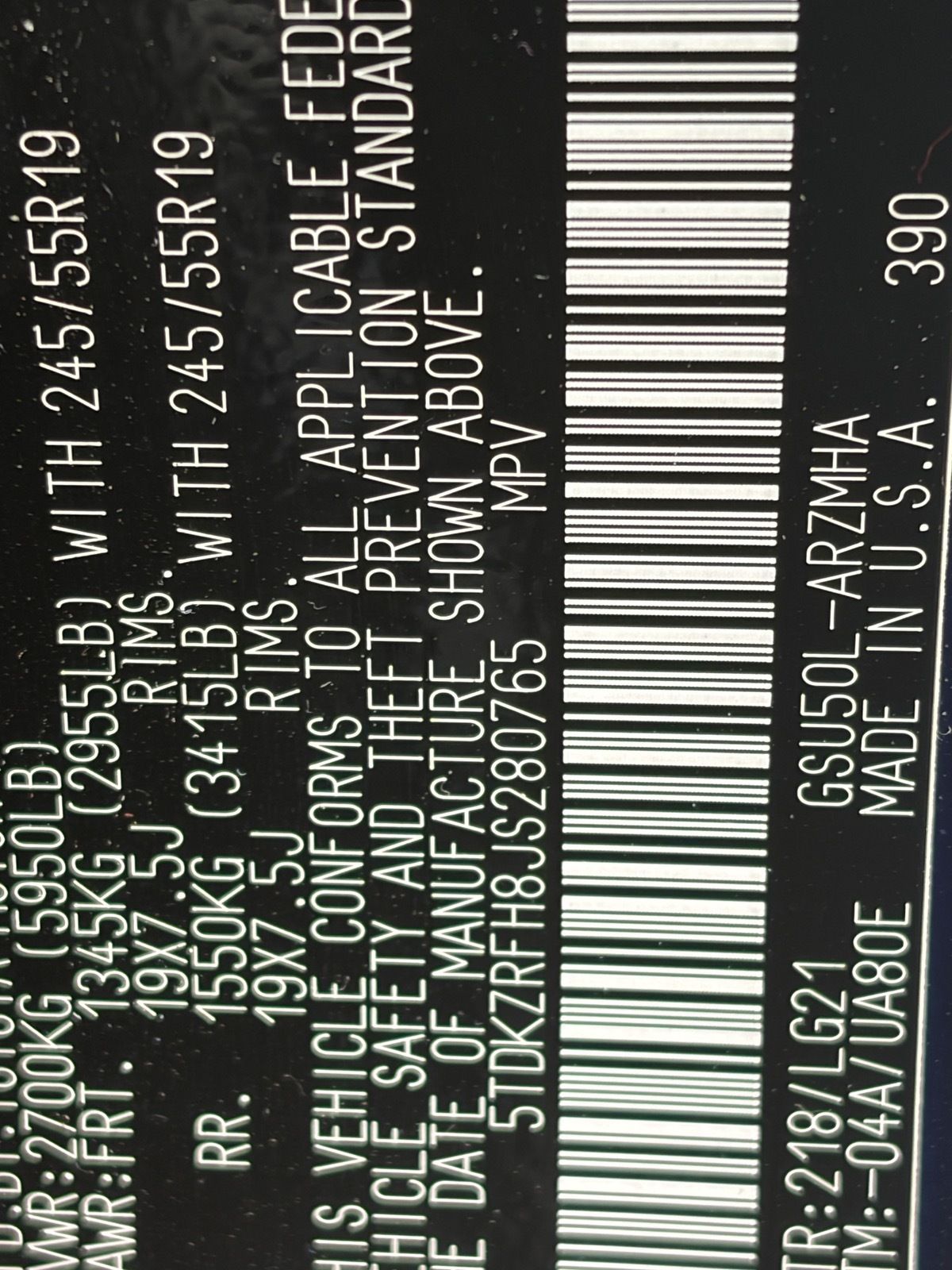 - VIN : 5TDKZRFH8JS280765
