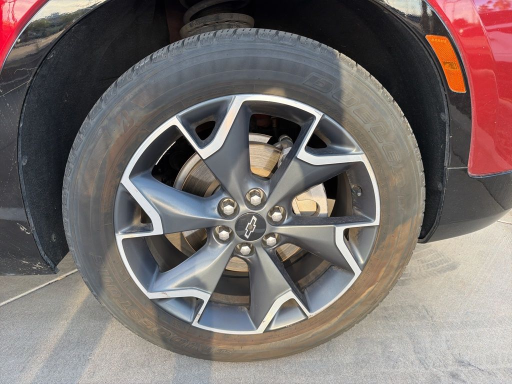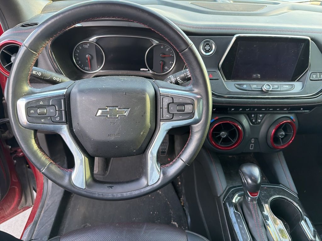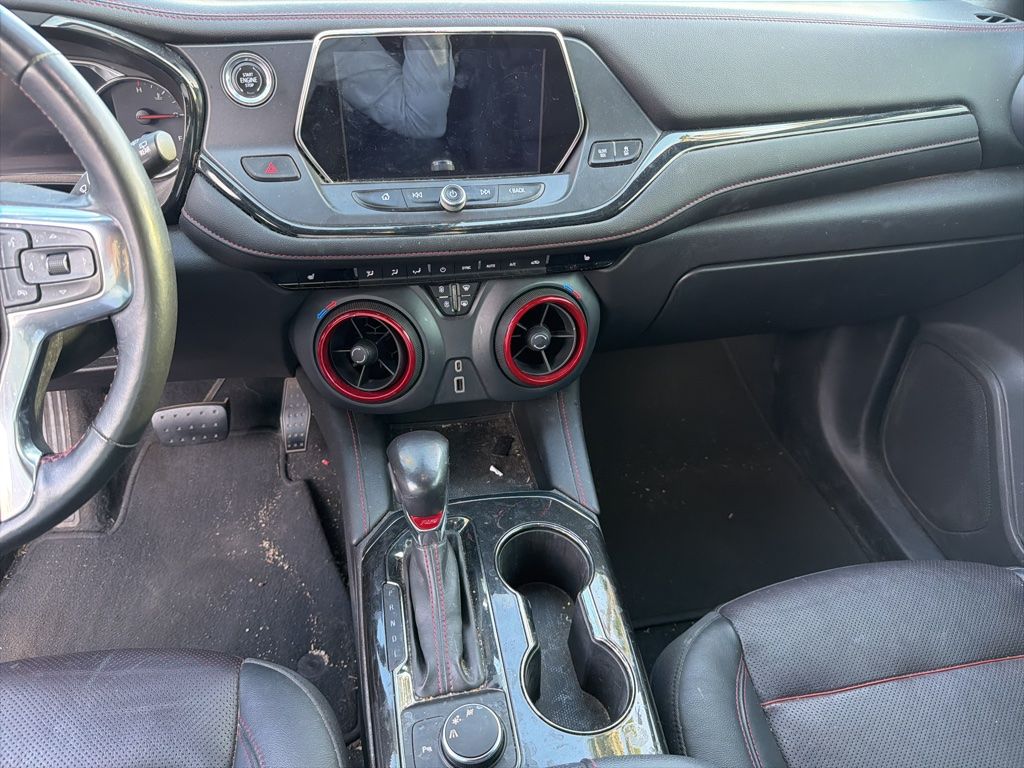 This Chevrolet Blazer is equipped with the following features: Preferred Equipment Group 1RS, 3.49 Final Drive Ratio, 4-Wheel Disc Brakes, 6 Speakers, 6-Speaker Audio System Feature, 6-Way Power Front Passenger Seat Adjuster, ABS brakes, Air Conditioning, Alloy wheels, AM/FM radio: SiriusXM, Apple CarPlay/Android Auto, Auto-dimming door mirrors, Auto-dimming Rear-View mirror, Automatic temperature control, Brake assist, Bumpers: body-color, Child-Seat-Sensing Airbag, Compass, Delay-off headlights, Driver door bin, Driver vanity mirror, Dual front impact airbags, Dual front side impact airbags, Electronic Stability Control, Emergency communication system: OnStar and Chevrolet connected services capable, Four wheel independent suspension, Front anti-roll bar, Front Bucket Seats, Front Center Armrest, Front dual zone A/C, Front reading lights, Fully automatic headlights, Garage door transmitter, Heated door mirrors, Heated Driver & Front Passenger Seats, Heated front seats, Heated steering wheel, High-Intensity Discharge Headlights, Illuminated entry, Knee airbag, Leather Shift Knob, Low tire pressure warning, Navigation System, Occupant sensing airbag, Outside temperature display, Overhead airbag, Overhead console, Panic alarm, Passenger door bin, Passenger vanity mirror, Perforated Leather-Appointed Seat Trim, Power door mirrors, Power driver seat, Power Liftgate, Power passenger seat, Power steering, Power windows, Radio data system, Radio: Chevrolet Infotainment 3 Plus System, Rear anti-roll bar, Rear reading lights, Rear seat center armrest, Rear window defroster, Rear window wiper, Remote keyless entry, Ride & Handling Suspension, Roof rack: rails only, Security system, Speed control, Speed-sensing steering, Split folding rear seat, Spoiler, Steering wheel mounted audio controls, Tachometer, Telescoping steering wheel, Tilt steering wheel, Traction control, Trip computer, Turn signal indicator mirrors, Variably intermittent wipers, Voltmeter, and Wheels: 20" Dark Android Machined-Face Aluminum.