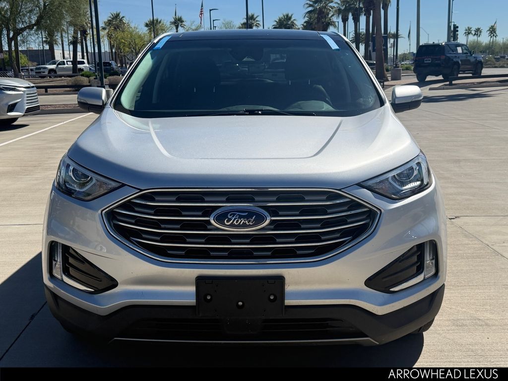 This Ford Edge is equipped with the following features: Equipment Group 201A (2 Driver Configurable 4.2" Color LCD Displays, ActiveX Seating Material Heated Bucket Seats, LED Signature Daytime Running Lamps, and Premium 9 Speaker Audio System), Cargo Accessory Package (Cargo Mat, Rear Bumper Protector, and Retractable Cargo Area Cover), Class II Trailer Tow Package, Cold Weather Package (Front & Rear Floor Liners, Heated Steering Wheel, and Windshield Wiper De-Icer), Convenience Package (110V/150W AC Power Outlet, Foot-Activated Hands-Free Liftgate, Perimeter Alarm, Remote Start System, Universal Garage Door Opener (UGDO), and Wireless Charging Pad), Ford Co-Pilot360 Assist+ (Adaptive Cruise Control w/Stop & Go, Evasive Steering Assist, Lane Centering, SiriusXM Traffic & Travel Link, and Voice-Activated Touchscreen Navigation System), AWD, 4-Wheel Disc Brakes, 6 Speakers, ABS brakes, Air Conditioning, Alloy wheels, AM/FM radio: SiriusXM, AppLink/Apple CarPlay and Android Auto, Auto High-beam Headlights, Auto-dimming Rear-View mirror, Automatic temperature control, Axle Ratio: TBA, Brake assist, Bumpers: body-color, Compass, Delay-off headlights, Driver door bin, Driver vanity mirror, Dual front impact airbags, Dual front side impact airbags, Electronic Stability Control, Emergency communication system: SYNC 3 911 Assist, Four wheel independent suspension, Front anti-roll bar, Front Bucket Seats, Front Center Armrest w/Storage, Front dual zone A/C, Front fog lights, Front reading lights, Fully automatic headlights, Heated door mirrors, Illuminated entry, Knee airbag, Low tire pressure warning, Occupant sensing airbag, Outside temperature display, Overhead airbag, Overhead console, Panic alarm, Panoramic Vista Roof, Passenger door bin, Passenger vanity mirror, Power door mirrors, Power driver seat, Power passenger seat, Power steering, Power windows, Radio: AM/FM Stereo/MP3 Capable, Rain sensing wipers, Rear anti-roll bar, Rear Parking Sensors, Rear reading lights, Rear seat center armrest, Rear window defroster, Rear window wiper, Remote keyless entry, Roof rack: rails only, SiriusXM Radio, Speed control, Speed-Sensitive Wipers, Split folding rear seat, Spoiler, Steering wheel mounted audio controls, SYNC 3 Communications & Entertainment System, Tachometer, Telescoping steering wheel, Tilt steering wheel, Traction control, Trip computer, Turn signal indicator mirrors, Unique Cloth Bucket Seats, Variably intermittent wipers, and Wheels: 18" Sparkle Silver-Painted Aluminum.