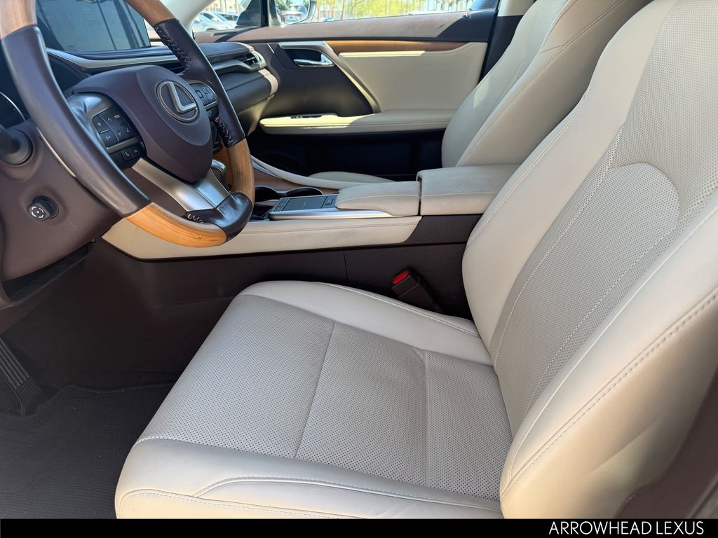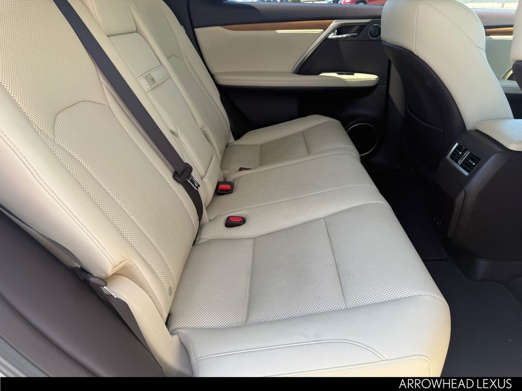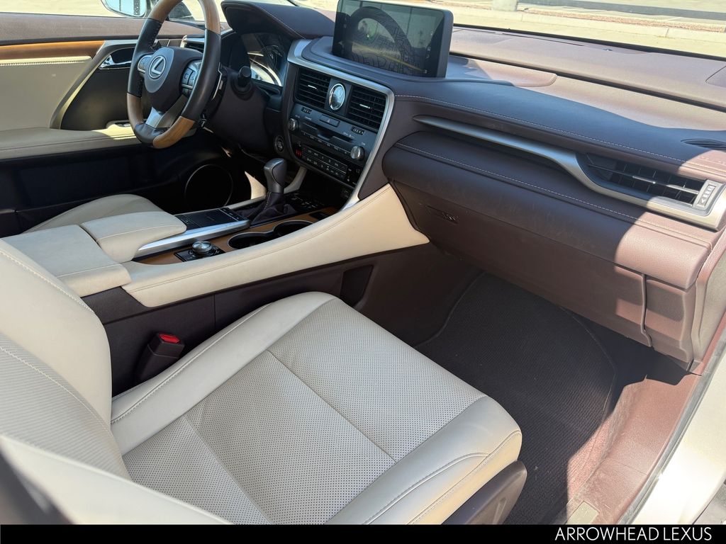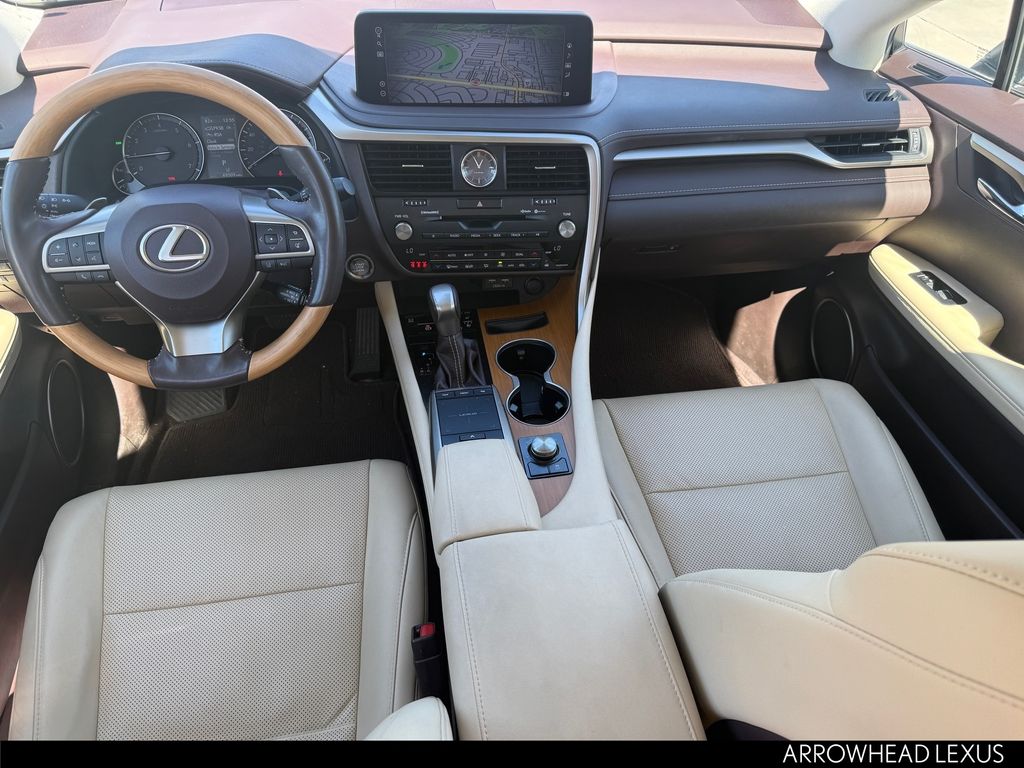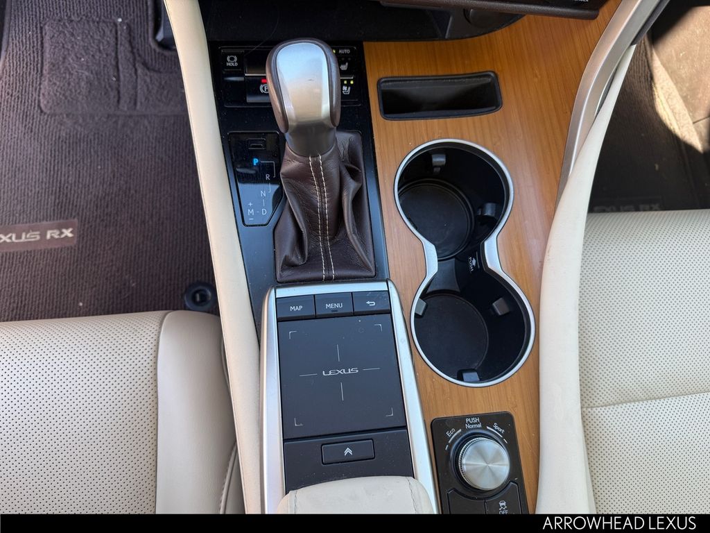 This Lexus RX is equipped with the following features: Parchment Artificial Leather, 3.329 Axle Ratio, 4-Wheel Disc Brakes, 9 Speakers, ABS brakes, Air Conditioning, Alloy wheels, AM/FM radio: SiriusXM, AM/FM/CD Radio, Anti-whiplash front head restraints, Apple CarPlay/Android Auto, Auto High-beam Headlights, Auto-dimming Rear-View mirror, Automatic temperature control, Brake assist, Bumpers: body-color, CD player, Compass, Delay-off headlights, Driver door bin, Driver vanity mirror, Dual front impact airbags, Dual front side impact airbags, Electronic Stability Control, Emergency communication system: Lexus Enform Safety Connect, Exterior Parking Camera Rear, Four wheel independent suspension, Front anti-roll bar, Front Bucket Seats, Front Center Armrest, Front dual zone A/C, Front reading lights, Fully automatic headlights, Garage door transmitter: HomeLink, Heated door mirrors, Illuminated entry, Knee airbag, Leather Shift Knob, Leather steering wheel, Low tire pressure warning, NuLuxe Seat Trim, Occupant sensing airbag, Outside temperature display, Overhead airbag, Overhead console, Panic alarm, Passenger door bin, Passenger vanity mirror, Power door mirrors, Power driver seat, Power Liftgate, Power passenger seat, Power steering, Power windows, Radio data system, Rain sensing wipers, Rear anti-roll bar, Rear reading lights, Rear seat center armrest, Rear side impact airbag, Rear window defroster, Rear window wiper, Remote keyless entry, Security system, Speed control, Speed-sensing steering, Split folding rear seat, Spoiler, Steering wheel mounted audio controls, Tachometer, Telescoping steering wheel, Tilt steering wheel, Traction control, Trip computer, Turn signal indicator mirrors, Variably intermittent wipers, and Wheels: 18" Split-5-Spoke Alloy.