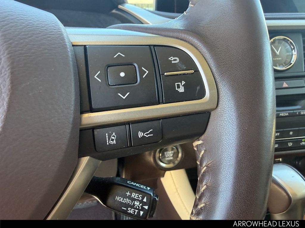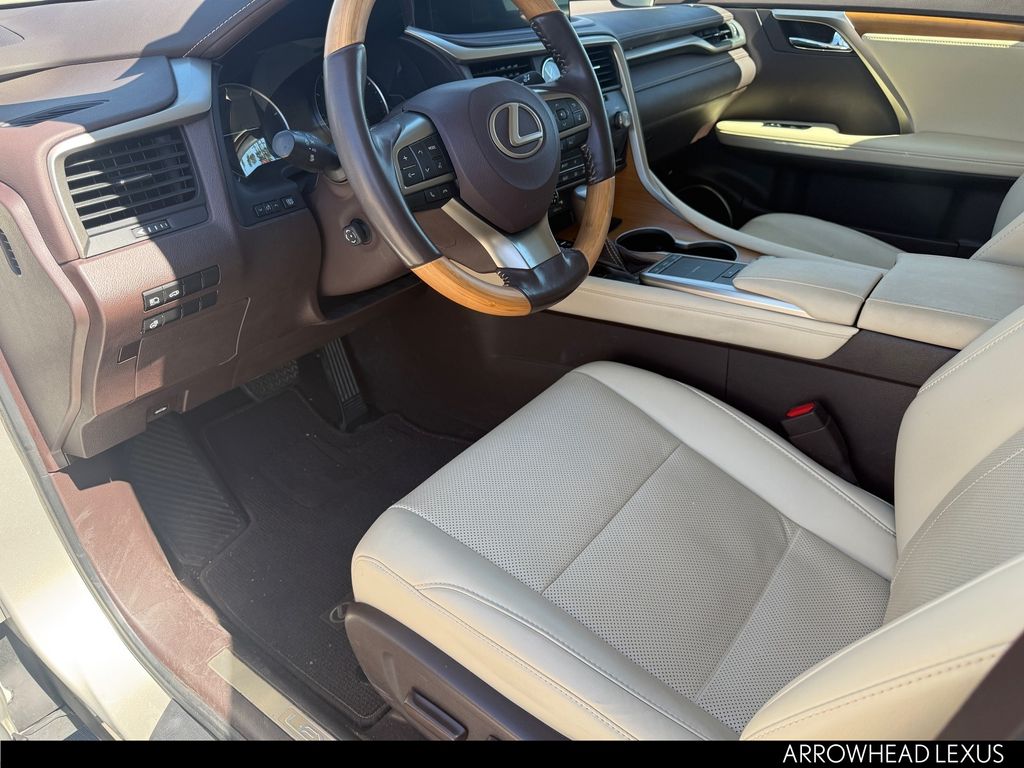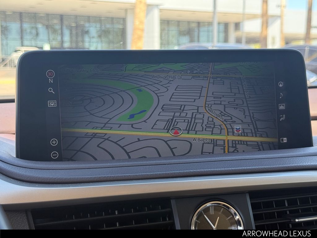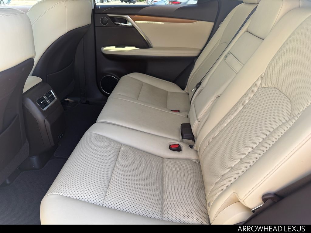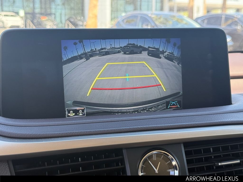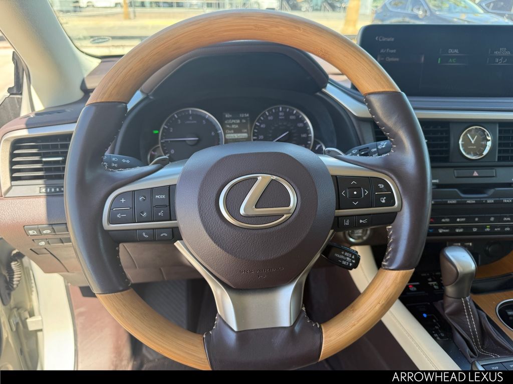 This Lexus RX is equipped with the following features: Parchment Artificial Leather, 3.329 Axle Ratio, 4-Wheel Disc Brakes, 9 Speakers, ABS brakes, Air Conditioning, Alloy wheels, AM/FM radio: SiriusXM, AM/FM/CD Radio, Anti-whiplash front head restraints, Apple CarPlay/Android Auto, Auto High-beam Headlights, Auto-dimming Rear-View mirror, Automatic temperature control, Brake assist, Bumpers: body-color, CD player, Compass, Delay-off headlights, Driver door bin, Driver vanity mirror, Dual front impact airbags, Dual front side impact airbags, Electronic Stability Control, Emergency communication system: Lexus Enform Safety Connect, Exterior Parking Camera Rear, Four wheel independent suspension, Front anti-roll bar, Front Bucket Seats, Front Center Armrest, Front dual zone A/C, Front reading lights, Fully automatic headlights, Garage door transmitter: HomeLink, Heated door mirrors, Illuminated entry, Knee airbag, Leather Shift Knob, Leather steering wheel, Low tire pressure warning, NuLuxe Seat Trim, Occupant sensing airbag, Outside temperature display, Overhead airbag, Overhead console, Panic alarm, Passenger door bin, Passenger vanity mirror, Power door mirrors, Power driver seat, Power Liftgate, Power passenger seat, Power steering, Power windows, Radio data system, Rain sensing wipers, Rear anti-roll bar, Rear reading lights, Rear seat center armrest, Rear side impact airbag, Rear window defroster, Rear window wiper, Remote keyless entry, Security system, Speed control, Speed-sensing steering, Split folding rear seat, Spoiler, Steering wheel mounted audio controls, Tachometer, Telescoping steering wheel, Tilt steering wheel, Traction control, Trip computer, Turn signal indicator mirrors, Variably intermittent wipers, and Wheels: 18" Split-5-Spoke Alloy.