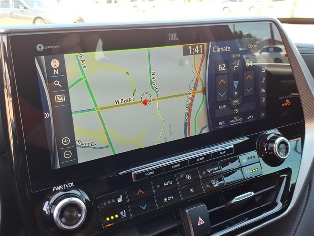 **Sun City Trade-Ins Lowest Miles Nicest Condition Vehicles in the Valley** This Toyota Highlander is equipped with the following features: Platinum Package (Digital Rearview Mirror w/HomeLink, High Grade LED Projector Headlights, Panoramic Moonroof, and Panoramic View Monitor), 11 Speakers, 20" Painted Alloy Wheels, 3.003 Axle Ratio, 3rd row seats: split-bench, 4-Wheel Disc Brakes, ABS brakes, Air Conditioning, Alloy wheels, AM/FM radio: SiriusXM, Apple CarPlay/Android Auto, Auto High-beam Headlights, Auto-dimming Rear-View mirror, Automatic temperature control, Brake assist, Bumpers: body-color, Delay-off headlights, Driver door bin, Driver vanity mirror, Dual front impact airbags, Dual front side impact airbags, Electronic Stability Control, Emergency communication system: Safety Connect with 1-year trial, Four wheel independent suspension, Front anti-roll bar, Front Bucket Seats, Front Center Armrest, Front dual zone A/C, Front fog lights, Front reading lights, Fully automatic headlights, Garage door transmitter: HomeLink, Heads-Up Display, Heated door mirrors, Heated front seats, Heated rear seats, Heated steering wheel, Heated/Ventilated Front Bucket Seats, Illuminated entry, Knee airbag, Leather Seat Trim, Leather Shift Knob, Low tire pressure warning, Memory seat, Navigation System, Navigation system: Dynamic Navigation (3-year trial), Occupant sensing airbag, Outside temperature display, Overhead airbag, Overhead console, Panic alarm, Passenger door bin, Passenger vanity mirror, Power door mirrors, Power driver seat, Power Liftgate, Power moonroof, Power passenger seat, Power steering, Power windows, Radio: Premium Audio w/JBL Clari-Fi, Rain sensing wipers, Rear air conditioning, Rear anti-roll bar, Rear reading lights, Rear window defroster, Rear window wiper, Reclining 3rd row seat, Remote keyless entry, Roof rack: rails only, Security system, Speed control, Speed-sensing steering, Split folding rear seat, Spoiler, Steering wheel mounted audio controls, Tachometer, Telescoping steering wheel, Tilt steering wheel, Traction control, Trip computer, Turn signal indicator mirrors, Variably intermittent wipers, and Ventilated front seats.