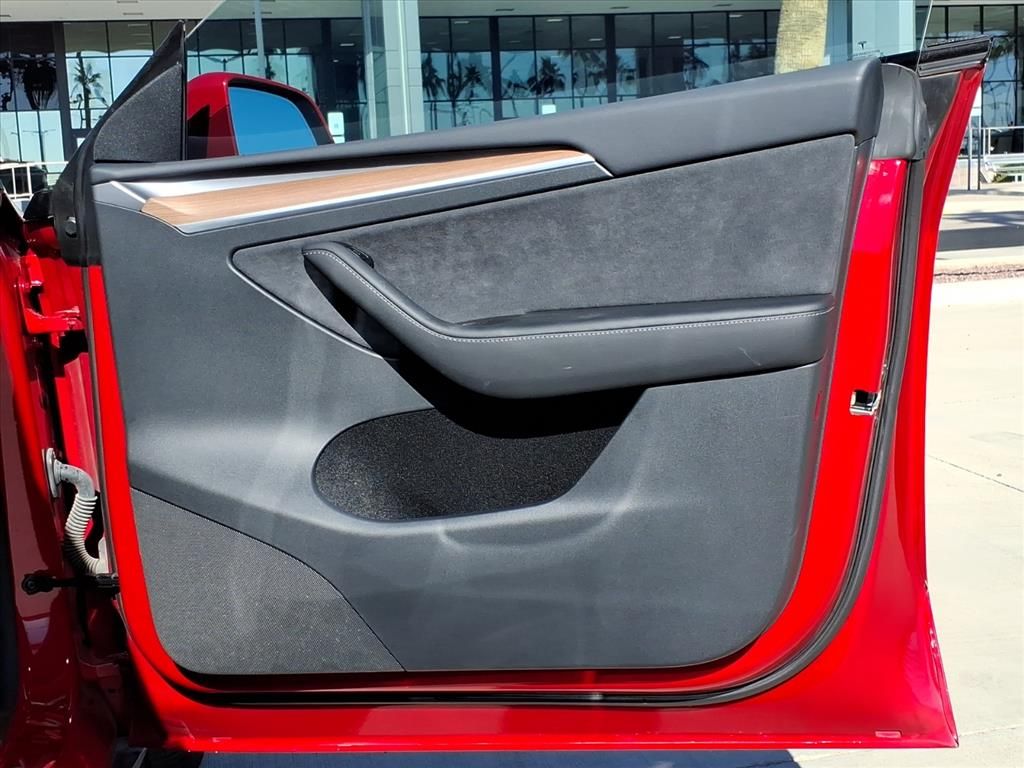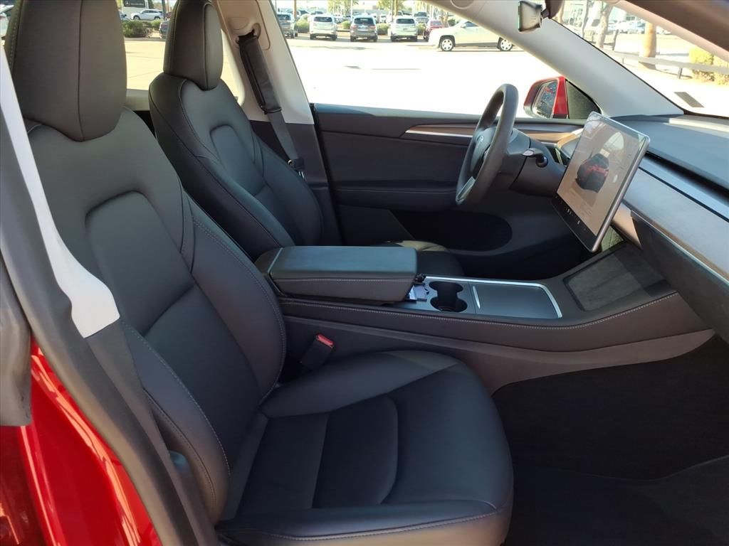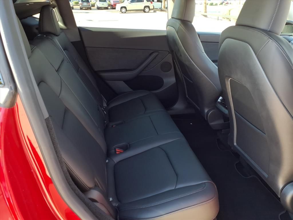 This Tesla Model Y is equipped with the following features: 14 Speakers, 4-Wheel Disc Brakes, 5 Seat Interior, 9.0 Axle Ratio, ABS brakes, Air Conditioning, Alloy wheels, Audio memory, Auto High-beam Headlights, Auto tilt-away steering wheel, Auto-dimming door mirrors, Auto-dimming Rear-View mirror, Automatic temperature control, Brake assist, Bumpers: body-color, Compass, Delay-off headlights, Driver door bin, Driver vanity mirror, Dual front impact airbags, Dual front side impact airbags, Electronic Stability Control, Emergency communication system, Exterior Parking Camera Rear, Four wheel independent suspension, Front anti-roll bar, Front Bucket Seats, Front Center Armrest, Front dual zone A/C, Front fog lights, Front reading lights, Fully automatic headlights, Genuine wood dashboard insert, Heated door mirrors, Heated front seats, Heated rear seats, Heated steering wheel, HVAC memory, Illuminated entry, Knee airbag, Lane Departure Warning System, Low tire pressure warning, Memory seat, Navigation System, Occupant sensing airbag, Outside temperature display, Overhead airbag, Passenger door bin, Passenger vanity mirror, Power door mirrors, Power driver seat, Power Liftgate, Power passenger seat, Power steering, Power windows, Premium Audio System, Radio data system, Rain sensing wipers, Rear reading lights, Rear seat center armrest, Rear window defroster, Security system, Speed control, Speed-sensing steering, Split folding rear seat, Steering wheel memory, Steering wheel mounted A/C controls, Steering wheel mounted audio controls, Telescoping steering wheel, Tilt steering wheel, Traction control, Trip computer, Variably intermittent wipers, Vegan Leather Seat Trim, and Wheels: 19" x 9.5" Gemini.