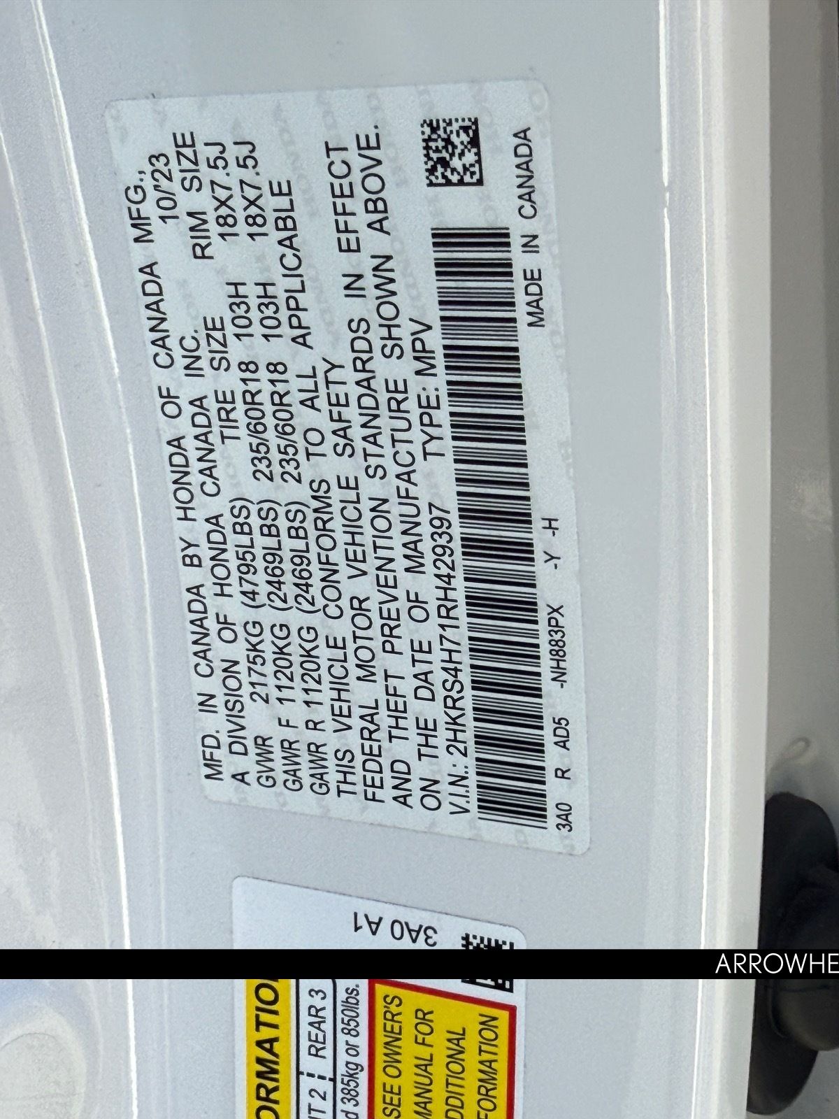 - VIN : 2HKRS4H71RH429397