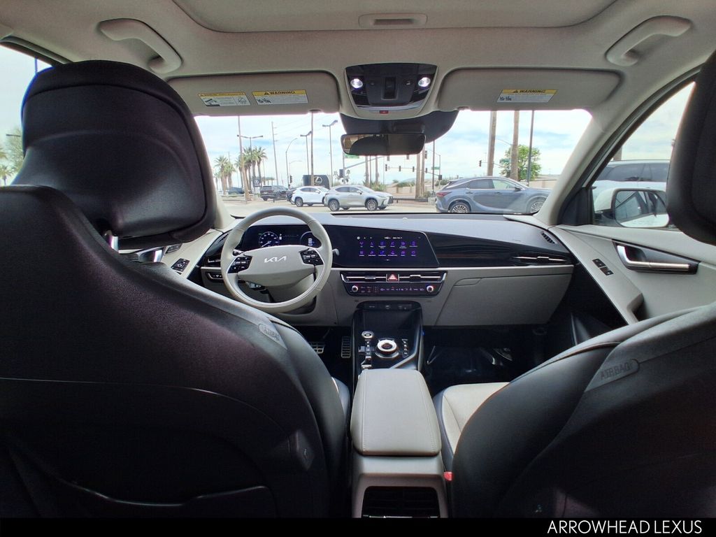 This Kia Niro EV is equipped with the following features: Light Gray Interior Color Package, Wave Preserve Package (Heat Pump and Heated Rear Seats), 10.65 Axle Ratio, 4-Wheel Disc Brakes, 7J x 17" Alloy Wheels, 8 Speakers, ABS brakes, Air Conditioning, Alloy wheels, AM/FM radio: SiriusXM, Apple CarPlay & Android Auto, Auto High-beam Headlights, Auto-dimming Rear-View mirror, Automatic temperature control, Brake assist, Bumpers: body-color, Cargo Net, Carpet Floor Mats, Delay-off headlights, Driver door bin, Driver vanity mirror, Dual front impact airbags, Dual front side impact airbags, Electronic Stability Control, Emergency communication system: Kia Connect (includes 1 year free trial), Exterior Parking Camera Rear, Four wheel independent suspension, Front anti-roll bar, Front Bucket Seats, Front Center Armrest, Front dual zone A/C, Front fog lights, Front reading lights, Fully automatic headlights, Garage door transmitter: HomeLink, Gray C-Pillar Trim, harman/kardon Speakers, Heads-Up Display, Heated & Ventilated Front Bucket Seats (3-Steps), Heated door mirrors, Heated front seats, Heated steering wheel, Illuminated entry, Interior Light Kit, Knee airbag, Low tire pressure warning, Memory seat, Navigation System, Occupant sensing airbag, Outside temperature display, Overhead airbag, Overhead console, Panic alarm, Passenger door bin, Passenger vanity mirror, Perforated Vegan Leather-Trimmed Seats, Power door mirrors, Power driver seat, Power Liftgate, Power moonroof, Power passenger seat, Power steering, Power windows, Radio: harman/kardon Premium Audio System, Rain sensing wipers, Rear anti-roll bar, Rear Bumper Applique, Rear seat center armrest, Rear window defroster, Rear window wiper, Remote keyless entry, Security system, Speed control, Speed-sensing steering, Split folding rear seat, Spoiler, Steering wheel mounted audio controls, Telescoping steering wheel, Tilt steering wheel, Traction control, Trip computer, Turn signal indicator mirrors, Variably intermittent wipers, Ventilated front seats, and Wheel Locks.