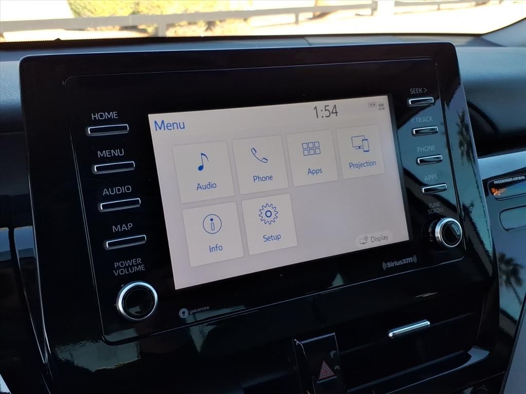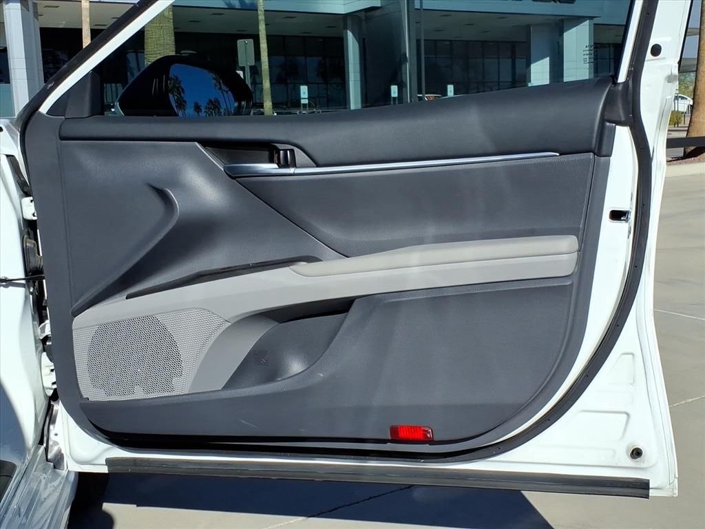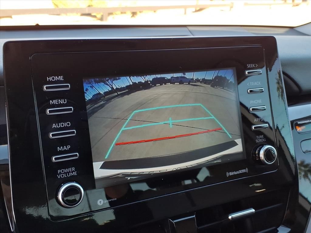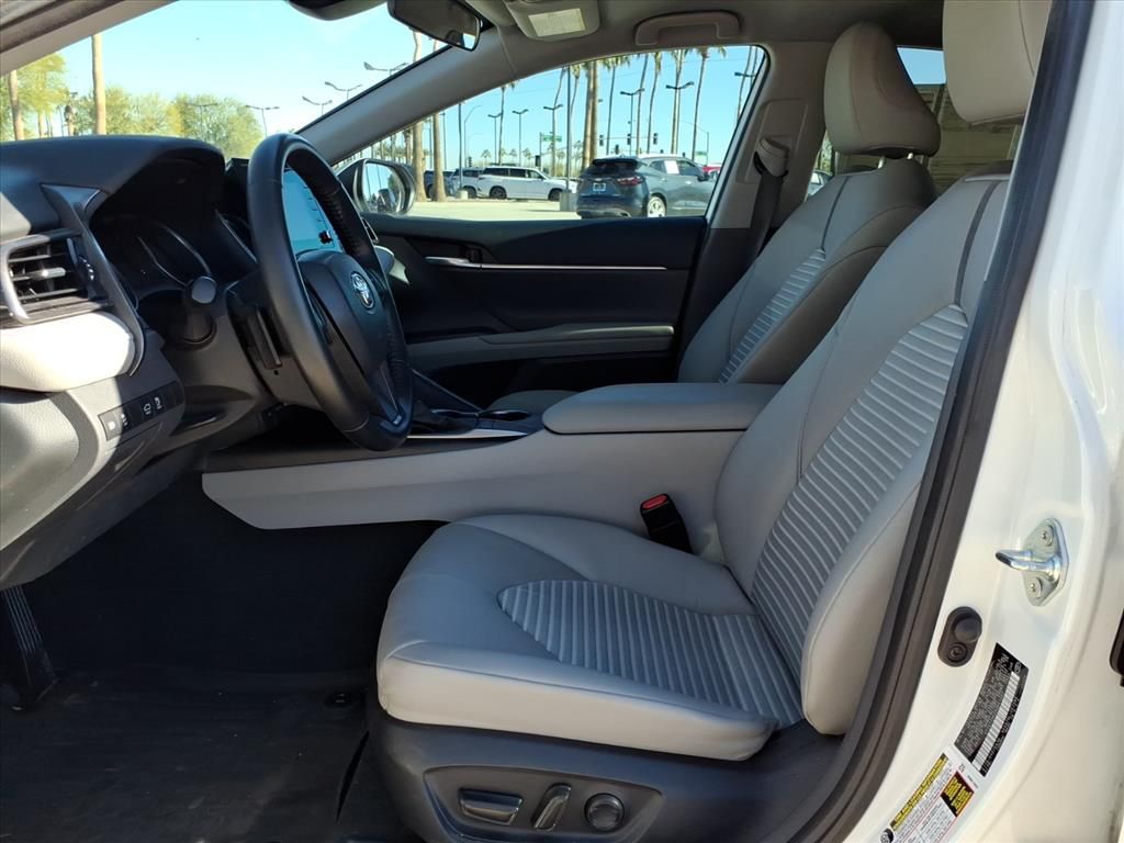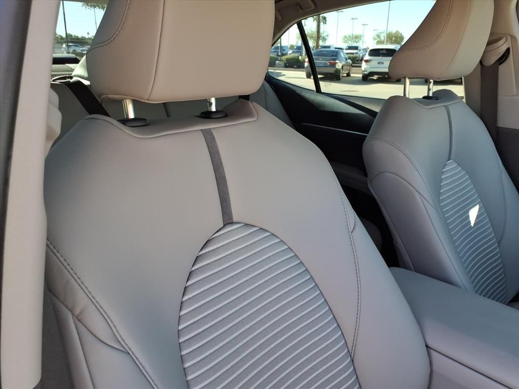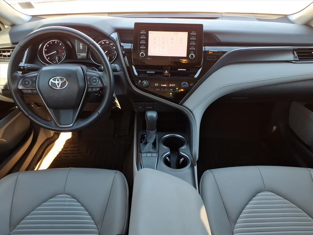 This Toyota Camry is equipped with the following features: Ash w/Sport SofTex Seat Trim w/Fabric Inserts, 18" x 8J Alloy Wheels, 4-Wheel Disc Brakes, 6 Speakers, ABS brakes, Air Conditioning, Alloy wheels, AM/FM radio: SiriusXM, Apple CarPlay/Android Auto, Auto High-beam Headlights, Automatic temperature control, Brake assist, Bumpers: body-color, Delay-off headlights, Driver door bin, Driver vanity mirror, Dual front impact airbags, Dual front side impact airbags, Electronic Stability Control, Emergency communication system: Safety Connect (1-year trial), Exterior Parking Camera Rear, Four wheel independent suspension, Front anti-roll bar, Front Bucket Seats, Front Center Armrest, Front dual zone A/C, Front reading lights, Fully automatic headlights, Heated door mirrors, Illuminated entry, Knee airbag, Leather steering wheel, Low tire pressure warning, Occupant sensing airbag, Outside temperature display, Overhead airbag, Overhead console, Panic alarm, Passenger door bin, Passenger vanity mirror, Power door mirrors, Power driver seat, Power steering, Power windows, Radio data system, Radio: Audio, Rear anti-roll bar, Rear seat center armrest, Rear side impact airbag, Rear window defroster, Remote keyless entry, Security system, Speed control, Speed-sensing steering, Split folding rear seat, Spoiler, Sport SofTex Seat Trim w/Fabric Inserts, Steering wheel mounted audio controls, Tachometer, Telescoping steering wheel, Tilt steering wheel, Traction control, Trip computer, Turn signal indicator mirrors, and Variably intermittent wipers.