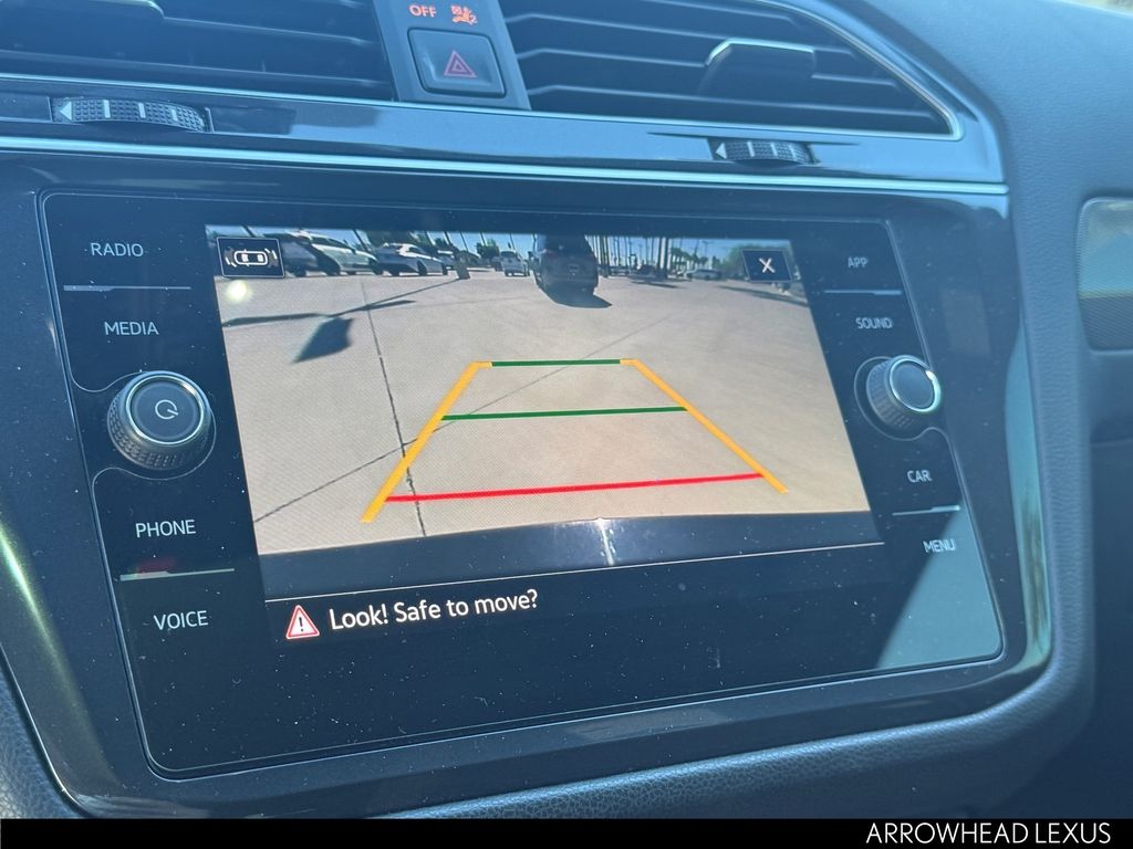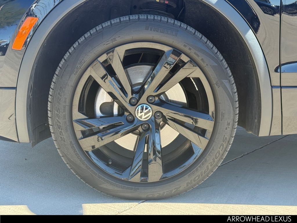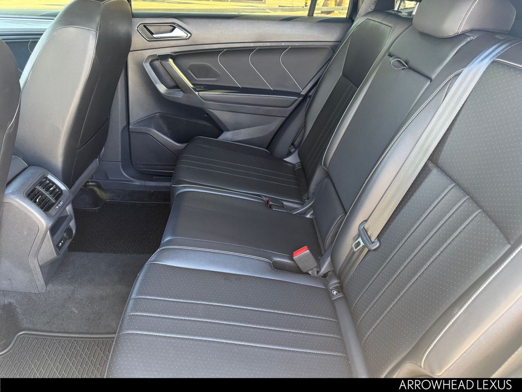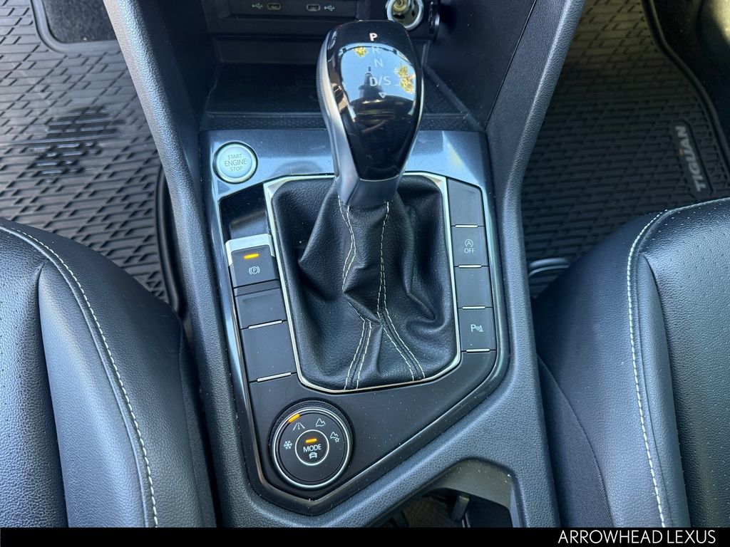 This Volkswagen Tiguan is equipped with the following features: AWD, 3.33 Axle Ratio, 4-Wheel Disc Brakes, 4-Wheel Independent Suspension, 6 Speakers, ABS brakes, Air Conditioning, Alloy wheels, AM/FM radio: SiriusXM with 360L, Auto-dimming Rear-View mirror, Automatic temperature control, Brake assist, Bumpers: body-color, Compass, Delay-off headlights, Driver door bin, Driver vanity mirror, Dual front impact airbags, Dual front side impact airbags, Electronic Stability Control, Emergency communication system: VW Car-Net Safe & Secure 5-year, Exterior Parking Camera Rear, Four wheel independent suspension, Front anti-roll bar, Front Bucket Seats, Front Center Armrest, Front dual zone A/C, Front reading lights, Fully automatic headlights, Heated door mirrors, Heated Front Seats, Heated front seats, Illuminated entry, Leather Shift Knob, Leather steering wheel, Low tire pressure warning, Occupant sensing airbag, Outside temperature display, Overhead airbag, Overhead console, Panic alarm, Passenger door bin, Passenger vanity mirror, Perforated V-Tex Leatherette Seating Surfaces, Power door mirrors, Power driver seat, Power Liftgate, Power moonroof, Power steering, Power windows, Radio data system, Radio: MIB3 Composition Media AM/FM/HD, Rain sensing wipers, Rear anti-roll bar, Rear reading lights, Rear seat center armrest, Rear window defroster, Rear window wiper, Remote keyless entry, Security system, Speed control, Speed-sensing steering, Split folding rear seat, Spoiler, Sport steering wheel, Steering wheel mounted audio controls, Tachometer, Telescoping steering wheel, Tilt steering wheel, Traction control, Trip computer, Turn signal indicator mirrors, Variably intermittent wipers, and Wheels: 19" Black Painted Twin 5-Spoke Alloy.