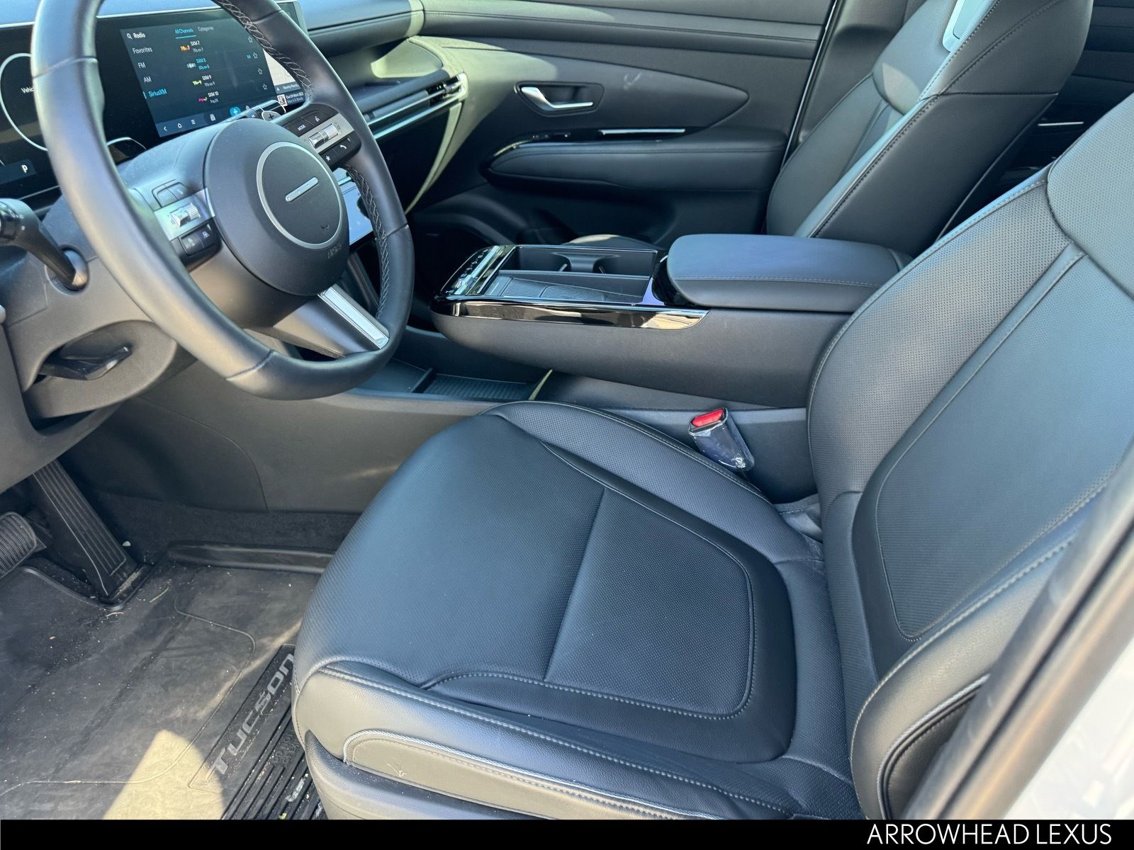 This Hyundai Tucson is equipped with the following features: Option Group 01, AWD, 19" Alloy Wheels, 4-Wheel Disc Brakes, 8 Speakers, ABS brakes, Air Conditioning, Alloy wheels, AM/FM radio: SiriusXM, Apple CarPlay & Android Auto, Auto High-beam Headlights, Auto-dimming Rear-View mirror, Automatic temperature control, Brake assist, Bumpers: body-color, Cargo Net, Cargo Organizer, Cargo Tray, Carpeted Floor Mats, Delay-off headlights, Driver door bin, Driver vanity mirror, Dual front impact airbags, Dual front side impact airbags, Electronic Stability Control, Emergency communication system: Bluelink+, First Aid Kit, Four wheel independent suspension, Front anti-roll bar, Front Bucket Seats, Front Center Armrest, Front dual zone A/C, Front reading lights, Fully automatic headlights, Garage door transmitter: HomeLink, Heads-Up Display, Heated & Ventilated Front Bucket Seats, Heated door mirrors, Heated front seats, Heated rear seats, Heated steering wheel, Illuminated entry, Leather steering wheel, Leather-Trimmed Seat Trim, Low tire pressure warning, Memory seat, Navigation System, Occupant sensing airbag, Outside temperature display, Overhead airbag, Overhead console, Panic alarm, Passenger door bin, Passenger vanity mirror, Power door mirrors, Power driver seat, Power Liftgate, Power moonroof, Power passenger seat, Power steering, Power windows, Radio data system, Radio: Bose Premium w/AM/FM/HD Audio System, Rain sensing wipers, Rear anti-roll bar, Rear reading lights, Rear seat center armrest, Rear side impact airbag, Rear window defroster, Rear window wiper, Remote keyless entry, Security system, Speed control, Split folding rear seat, Spoiler, Steering wheel mounted audio controls, Tachometer, Telescoping steering wheel, Tilt steering wheel, Traction control, Trip computer, Turn signal indicator mirrors, Variably intermittent wipers, Ventilated front seats, and Wheel Locks.